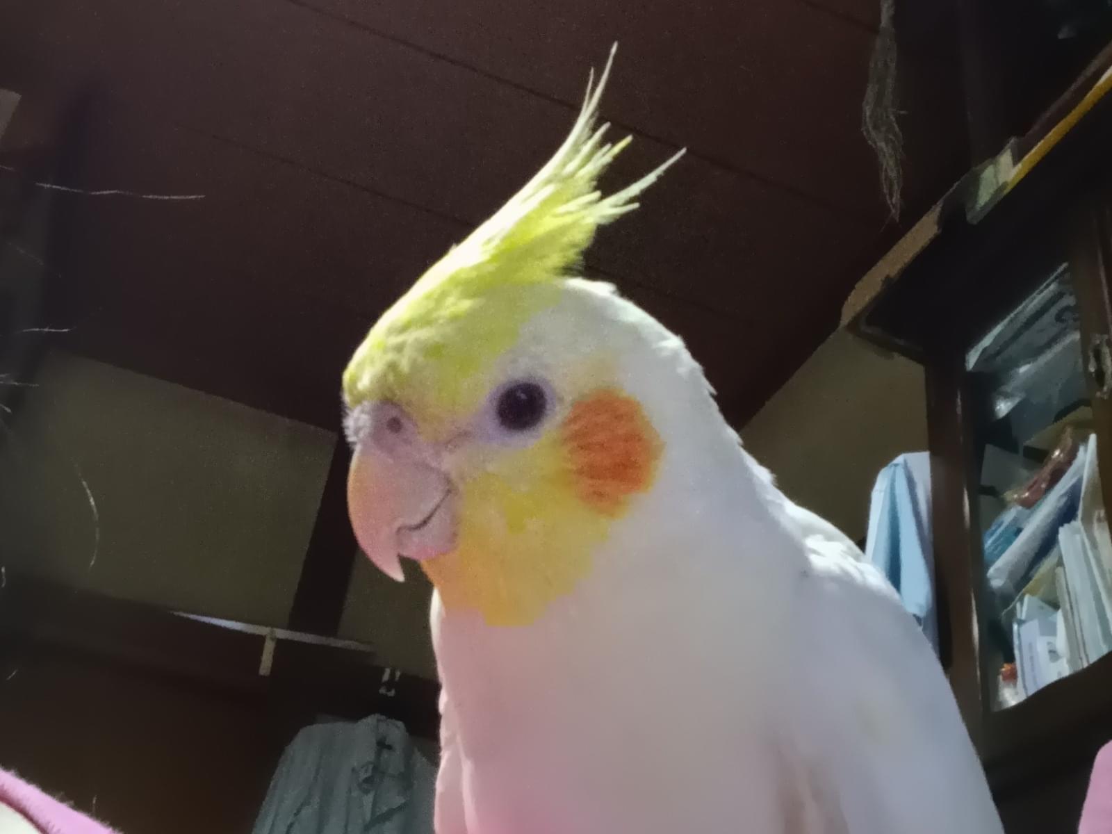 白いオカメインコ(ルチノー)で、顔と冠羽(とさか)が黄色で、オレンジのほっぺに白系の体で、尾羽根には少し黄色もあります。