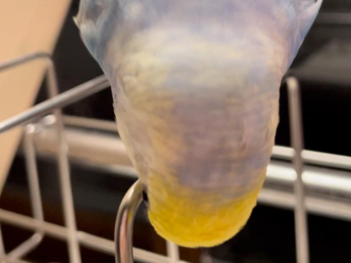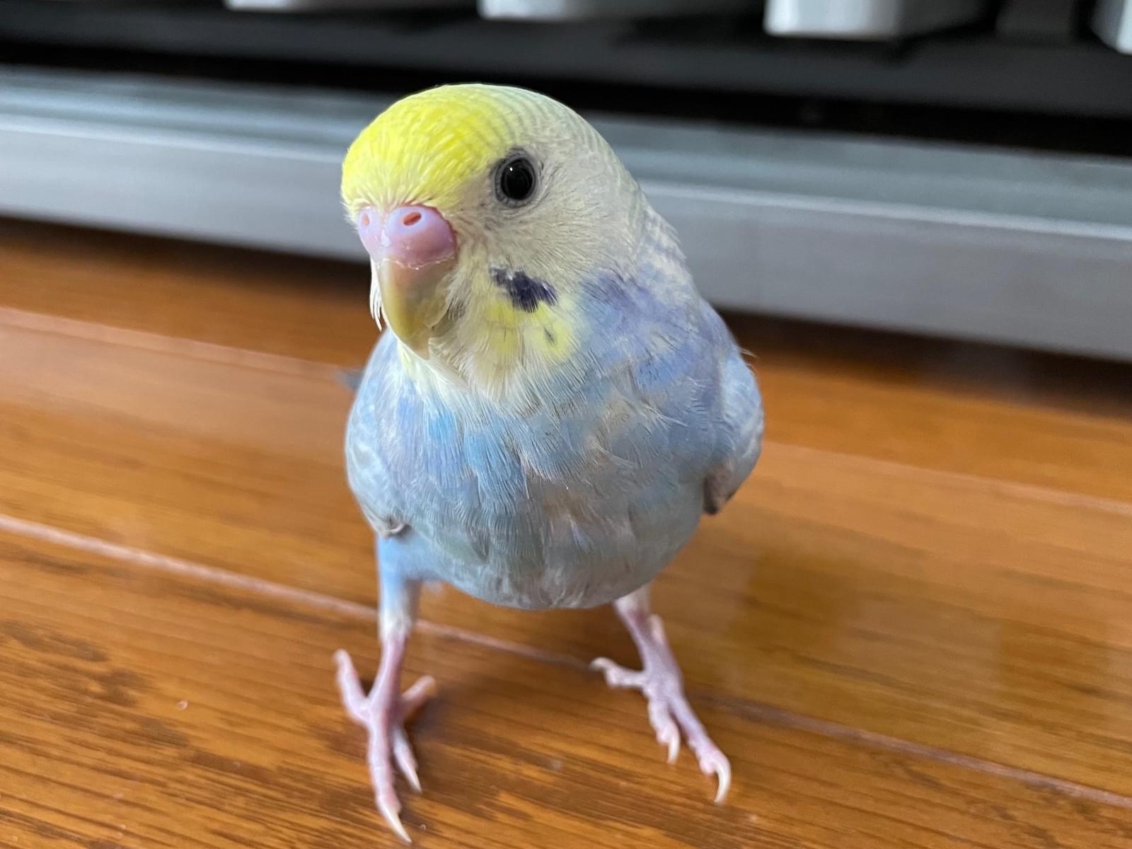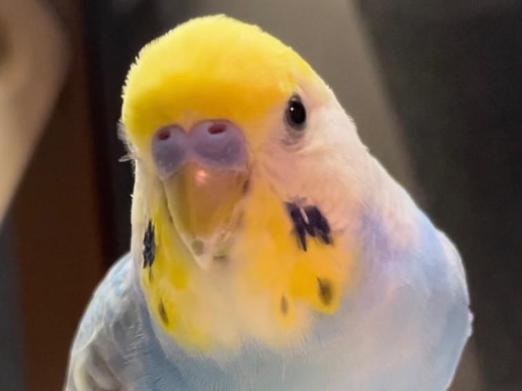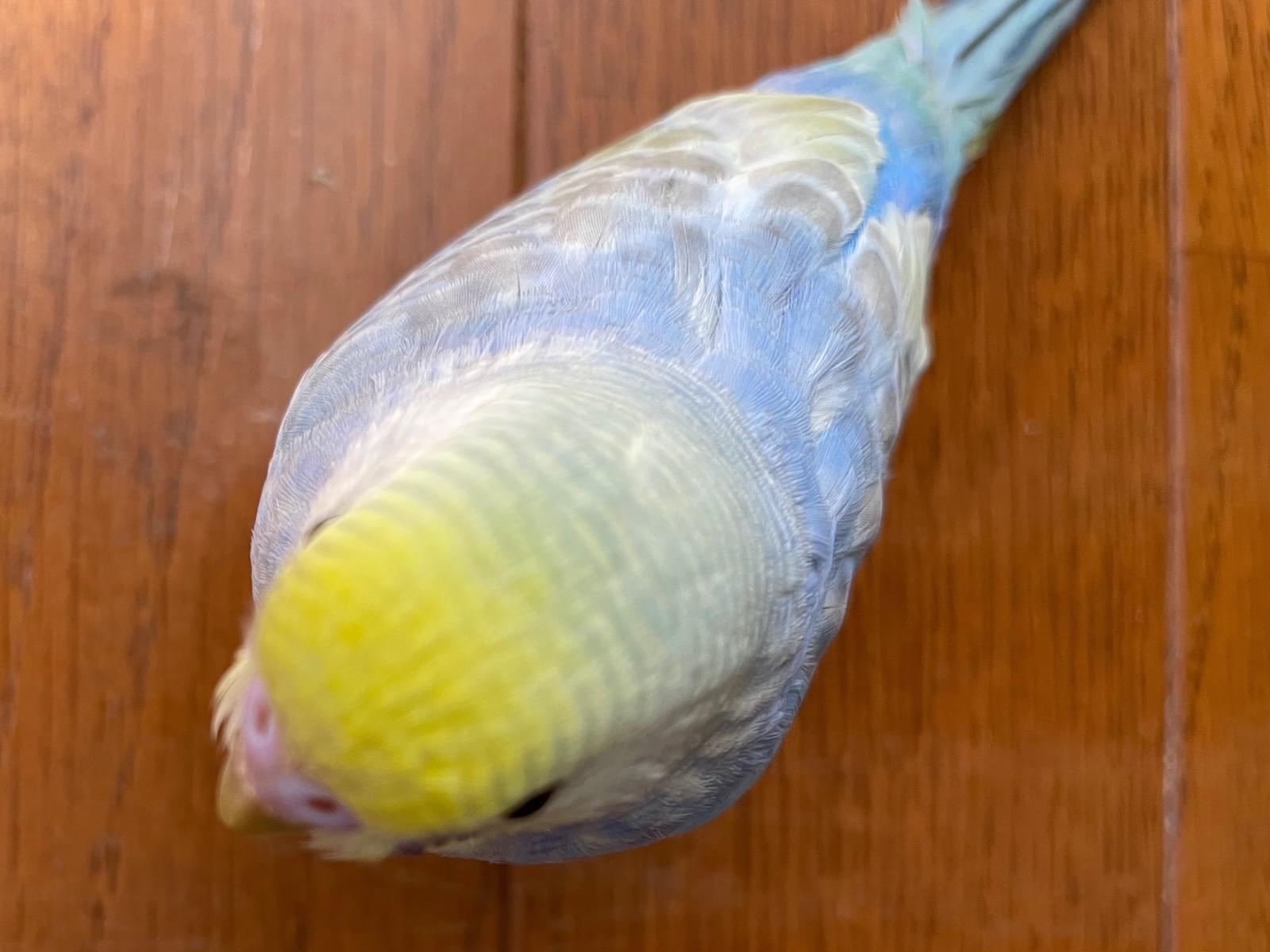 頭が黄色、体が水色とグレー、尻尾が紺色