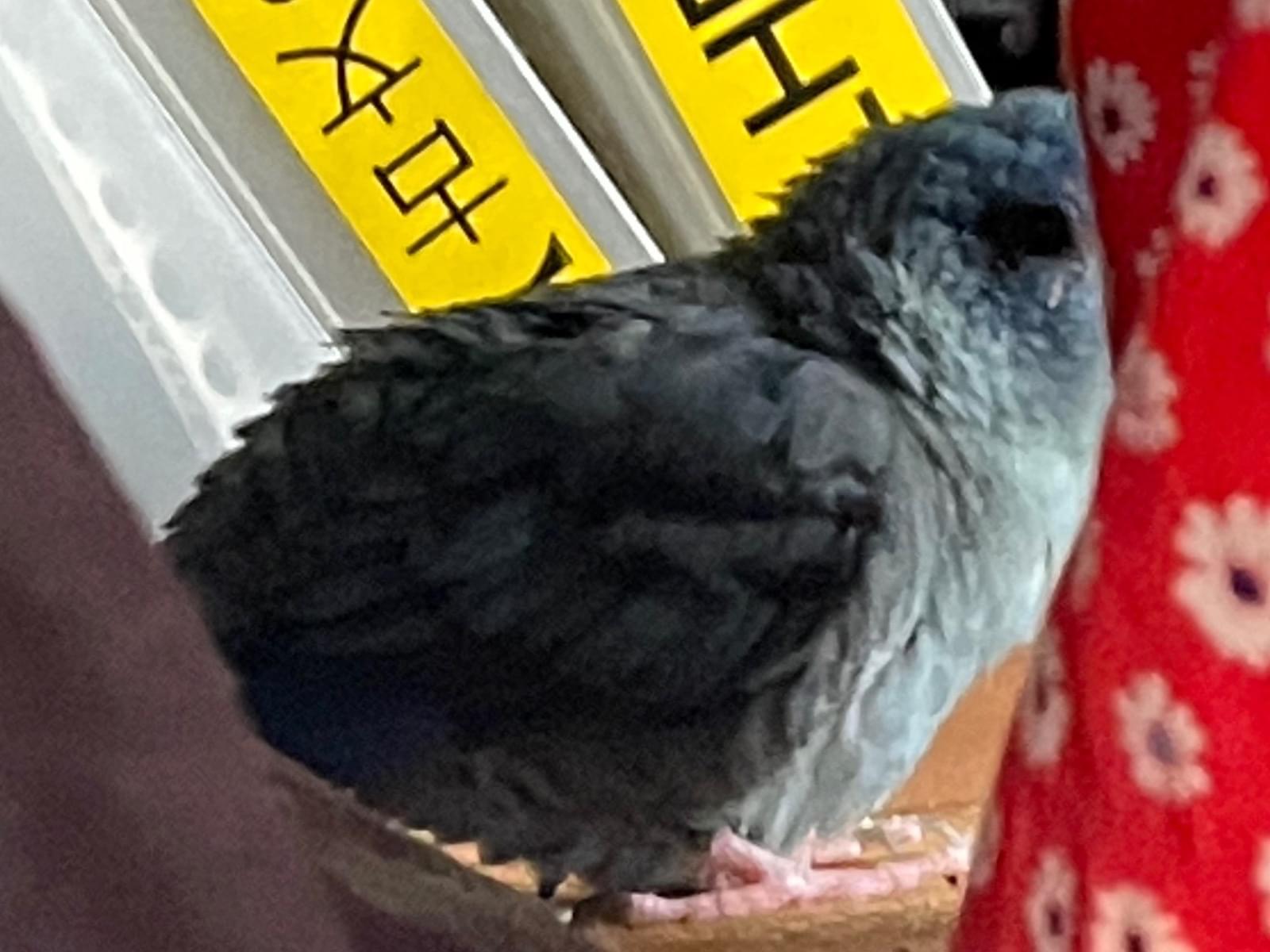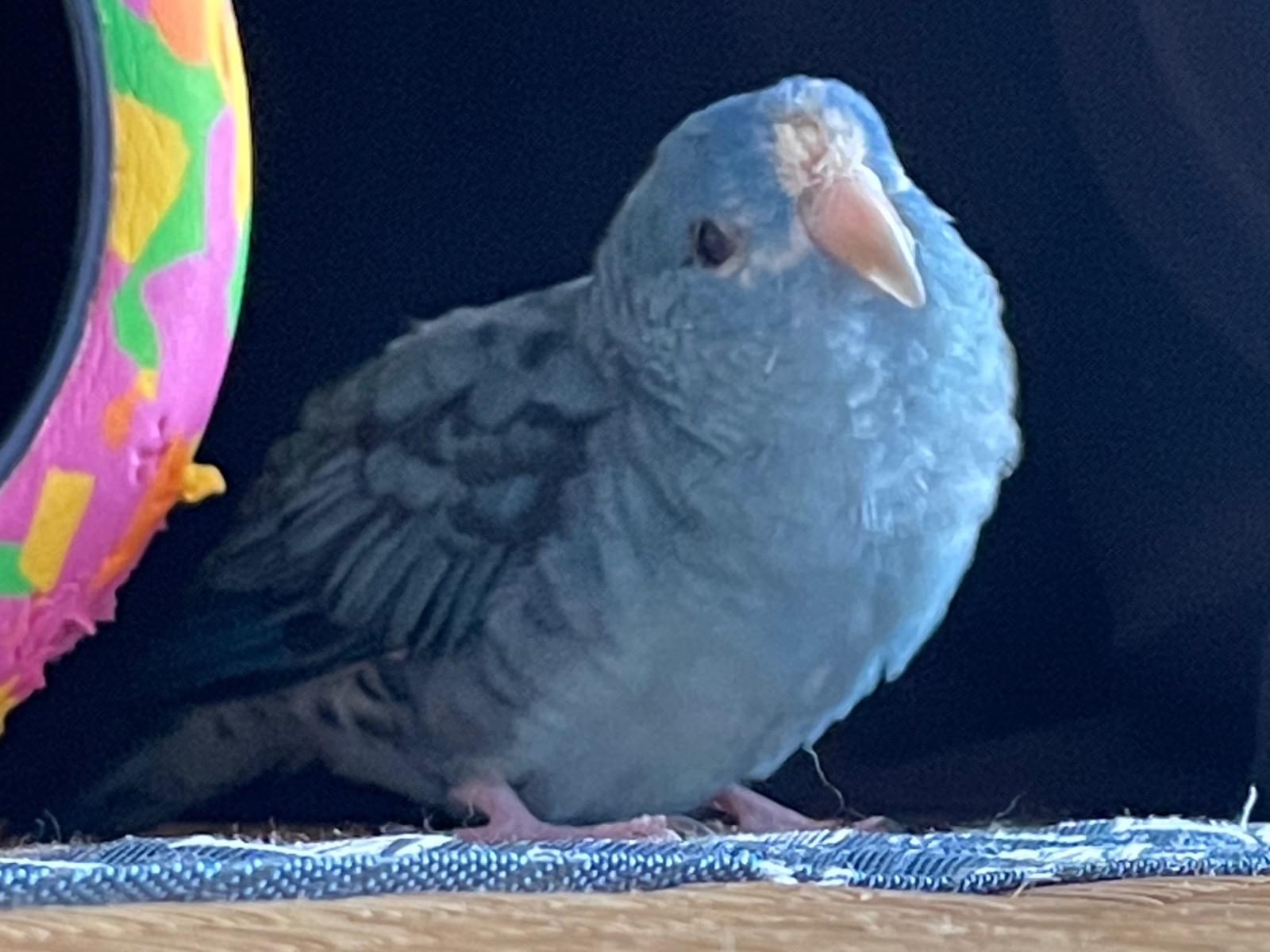 コバルトブルーのサザナミインコで、体調は13センチほど、鼻の頭の毛のみ白っぽくなっています。暗い場所だと体は全体的に黒っぽく見えるかもしれません。