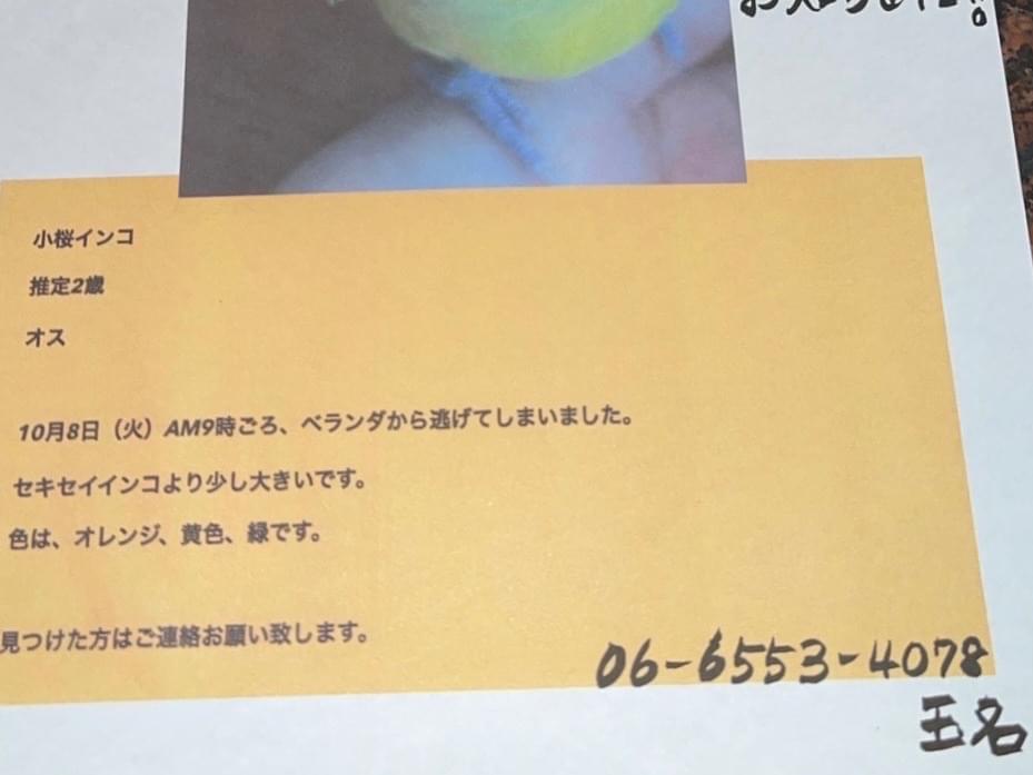 10/8(火)am9時頃  JR大正駅付近 住宅のベランダから出て行ってしまいました。