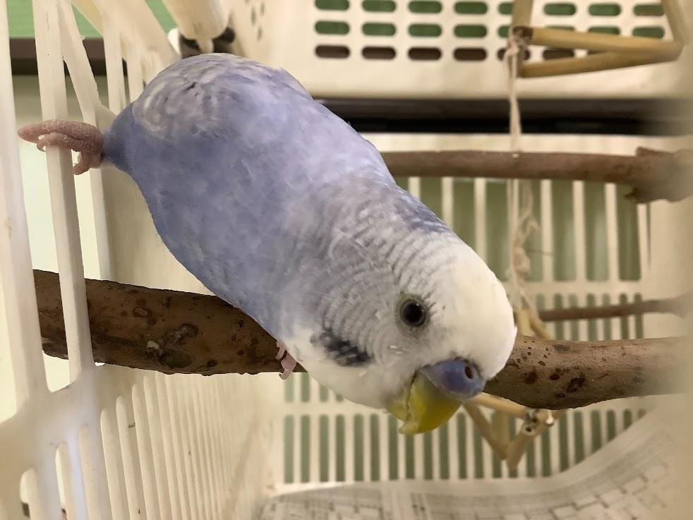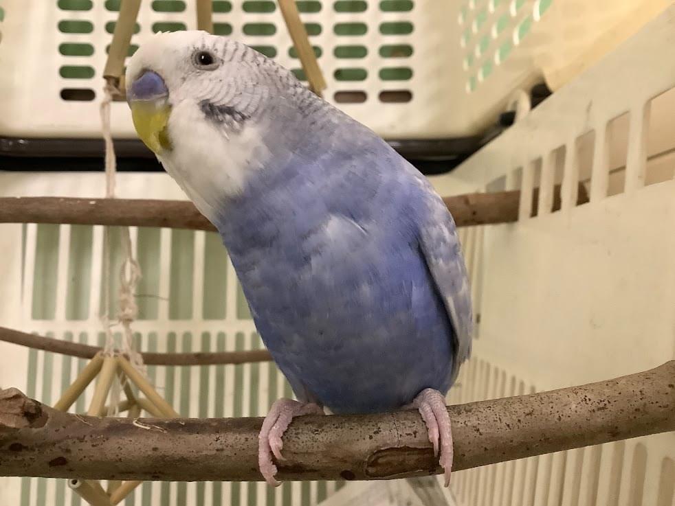 青っぽい色のセキセイインコで迷子になっているところを保護しました。