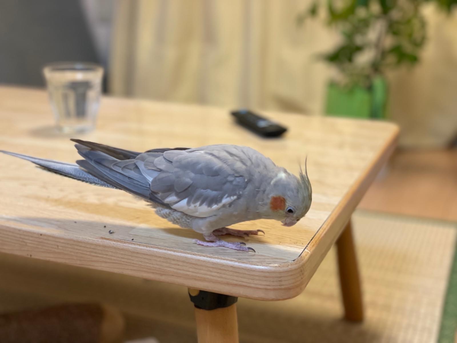全体にグレーで、ほっぺはオレンジです。しゃべりませんが甲高い声で鳴きます。飛びまわり、行動的です。肩や頭の上に乗ります。首や頭のまわりをなでられます。