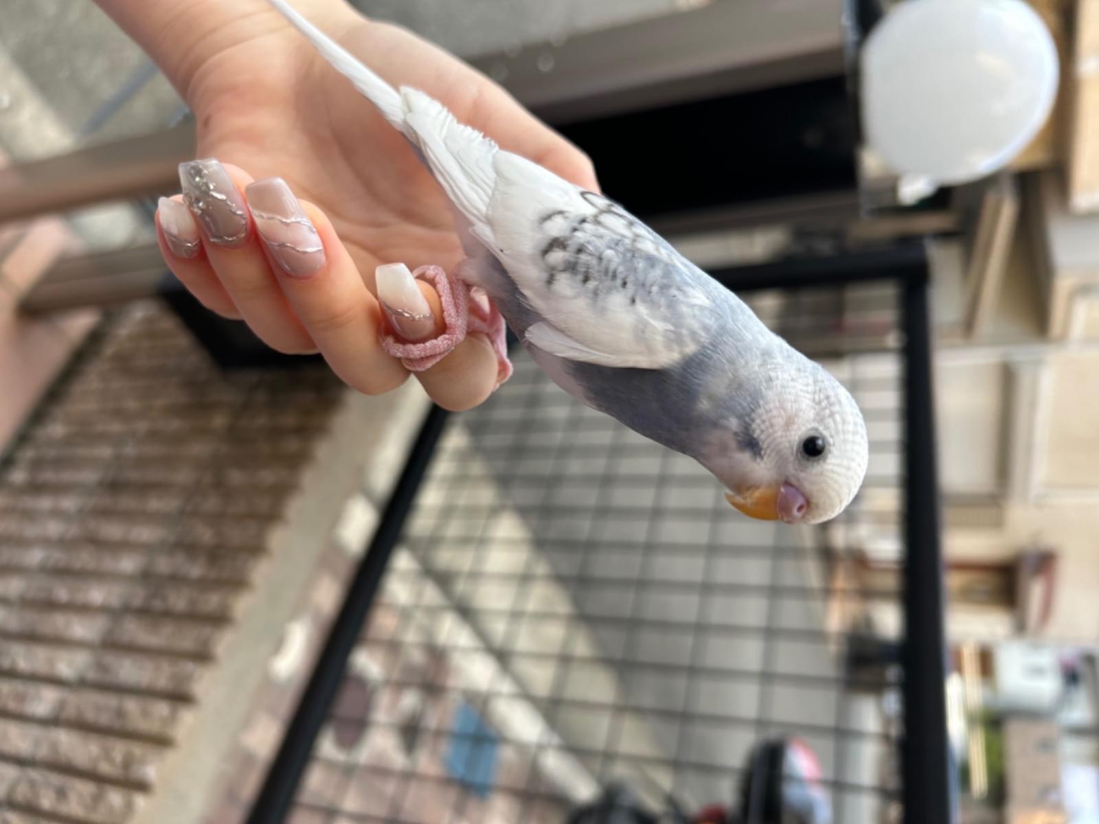 白と淡い青色と灰色のインコを保護しました。家では飼えないので警察に届けました。