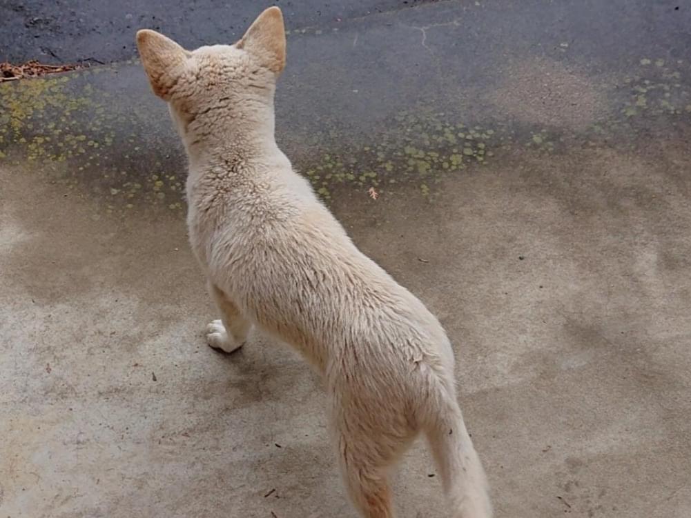 首輪 ハーネス無し。鳴き声はとても大きく、姿を見る前は大型犬かと思いました。性格は警戒している時は低く唸って吠える事はあまりありませんでしたが、慣れると飛び付いて手に甘噛みしてきます。