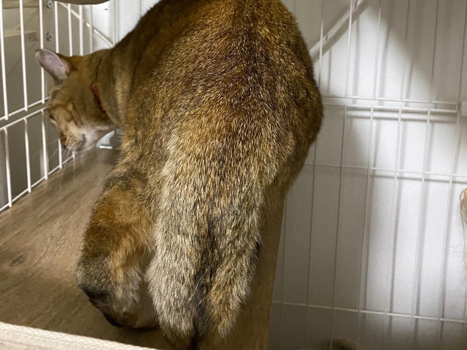 右足の指が少ない、赤茶の首輪をしたキジトラ保護してます。