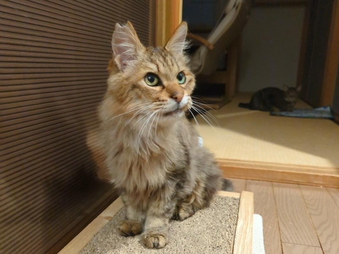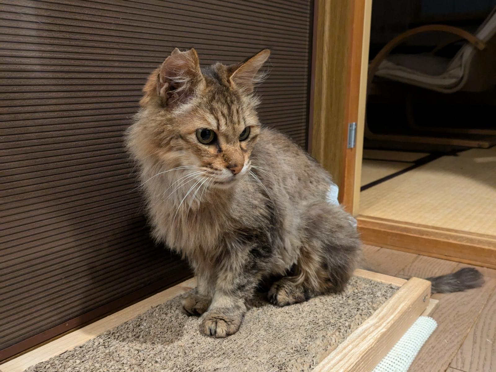 首輪なし。やや長毛。去勢済オス。右耳にカットあり。