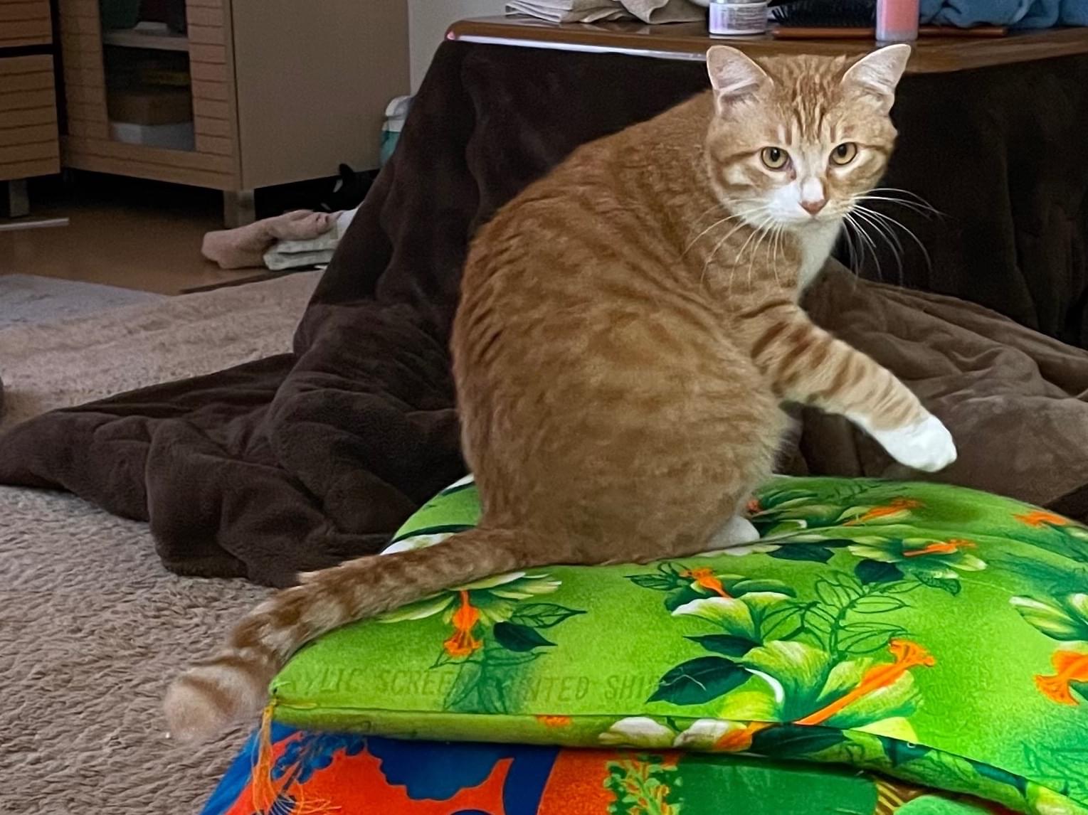 白と薄い茶色の毛です。尻尾の先がちょっと曲がっています。肉球はピンクです