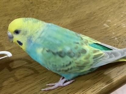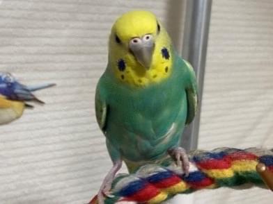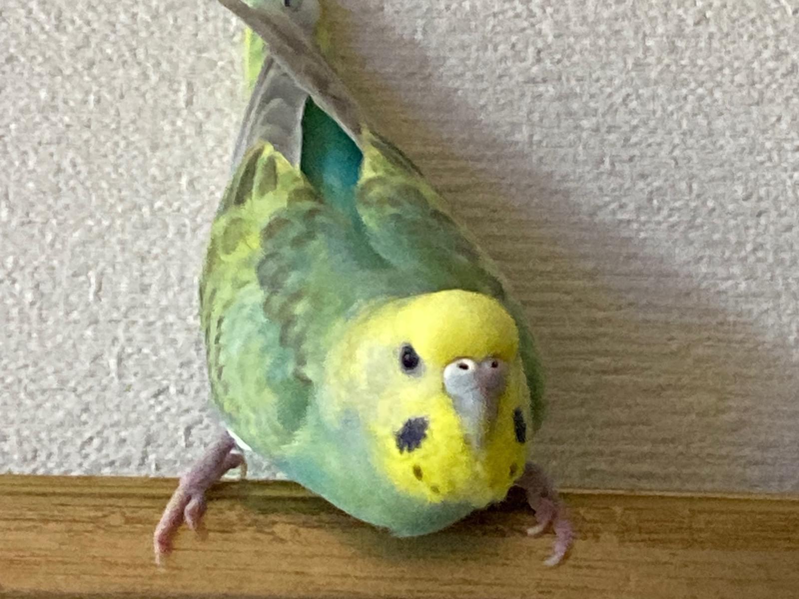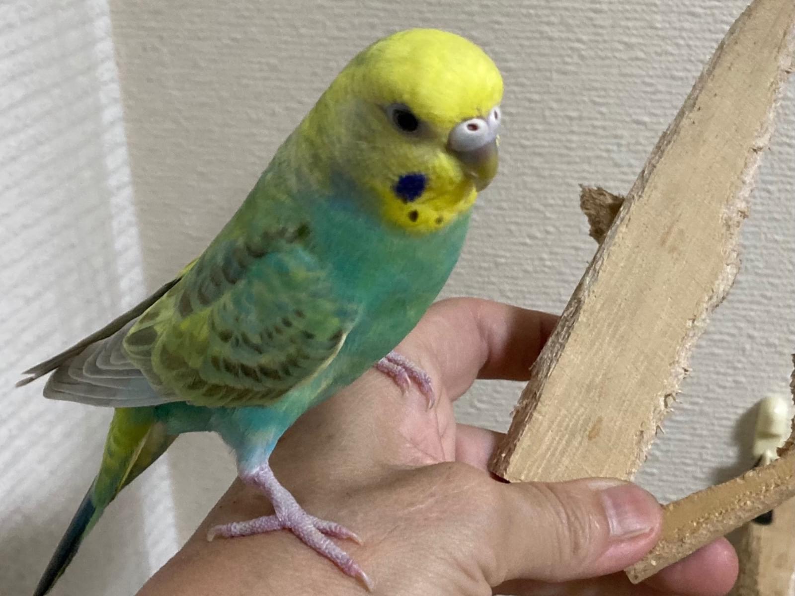 頭が黄色でエメラルドグリーンの鼻は肌色のメスのセキセイインコです。慣れていたので羽は切っていませんでした。人の指が好きです。