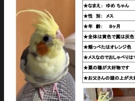 ホーム迷子鳥群馬県黄色いオカメインコを…黄色いオカメインコを探しています管理編集するポスター掲載終了最終更新日時:2024/10/24 11:43写真情報用件迷子名前ゆめ性別メス年齢8ヶ月場所群馬県 太田市発生日時2024年10月20日(日)飼い主ウッチー説明身体全体はイエローで、羽はグレーです。 とても人に懐いています。おしゃべりはしません。連絡先URL未設定掲示板情報交換のための掲示板です。ユーザーからの情報提供、オーナーからの連絡などにご利用下さいませ。書き込んだ情報は、オーナーのメールに通知されます。まだコメントはありません。トピックを作成する
