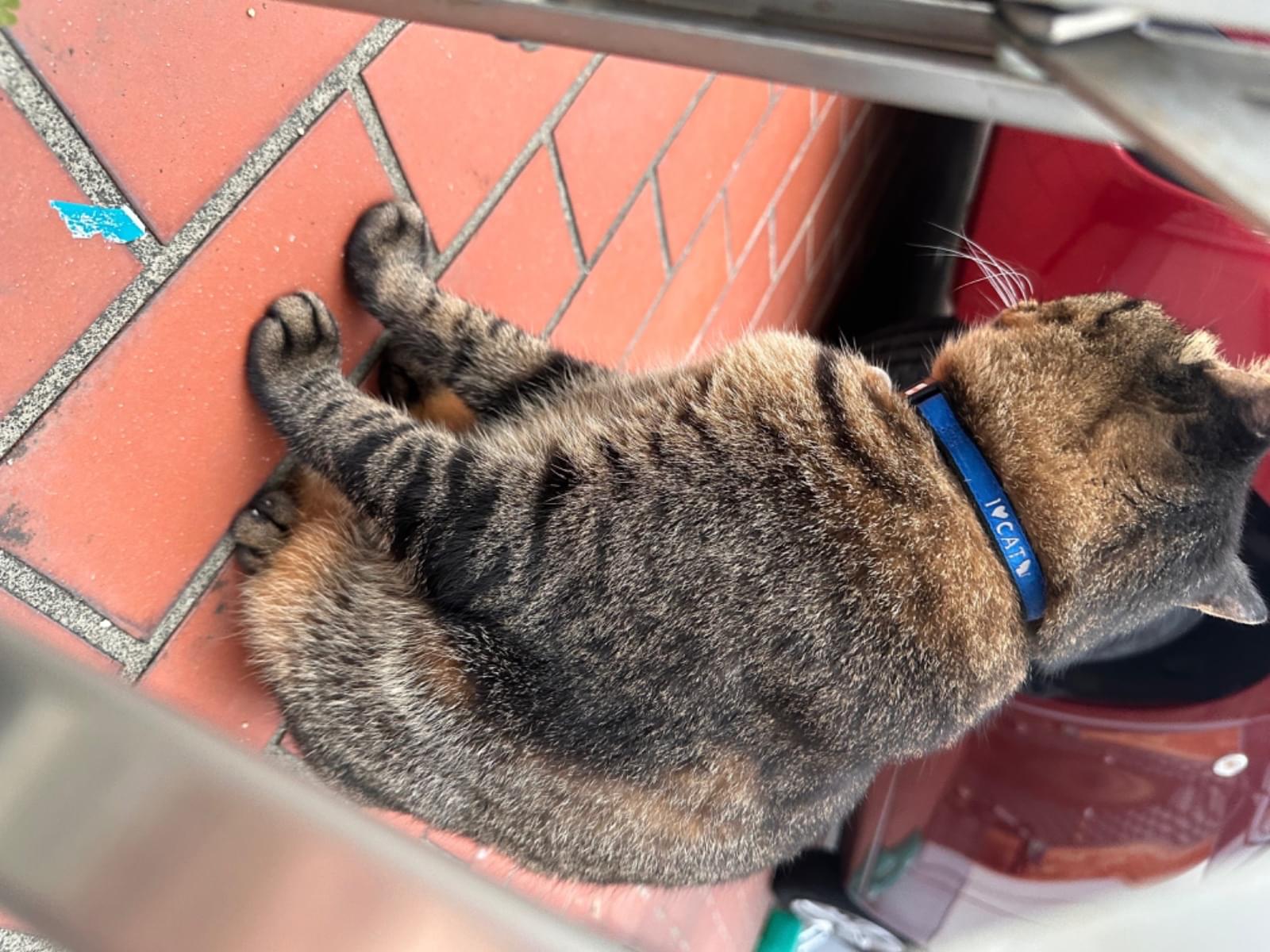 青い首輪のキジトラ、屋根の上でとても高い声で鳴いておりました。人によく懐いています。