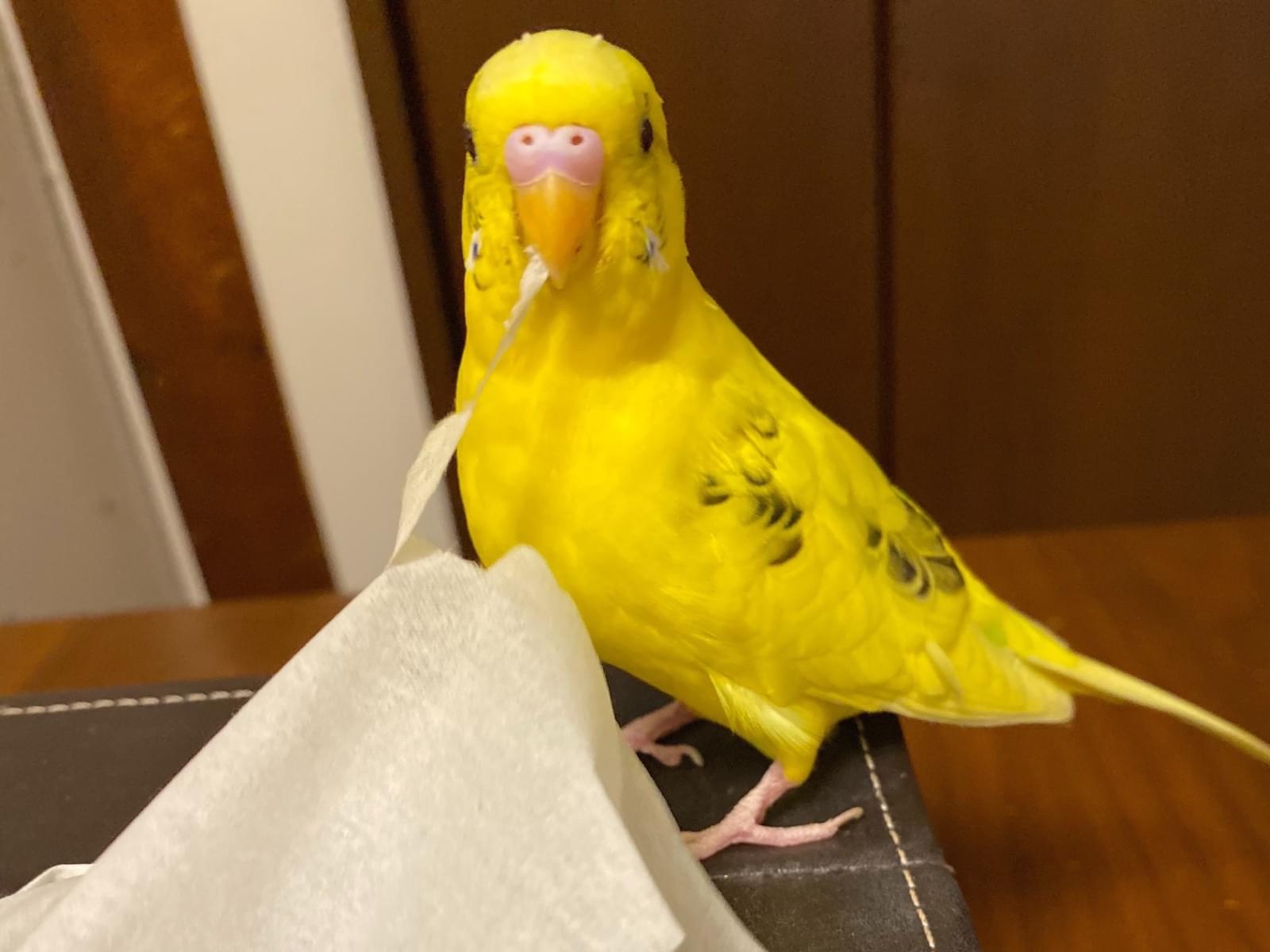 見た目は黄色く頭部と翼に黒い模様がありお腹と背中に緑の羽がすこし入っています