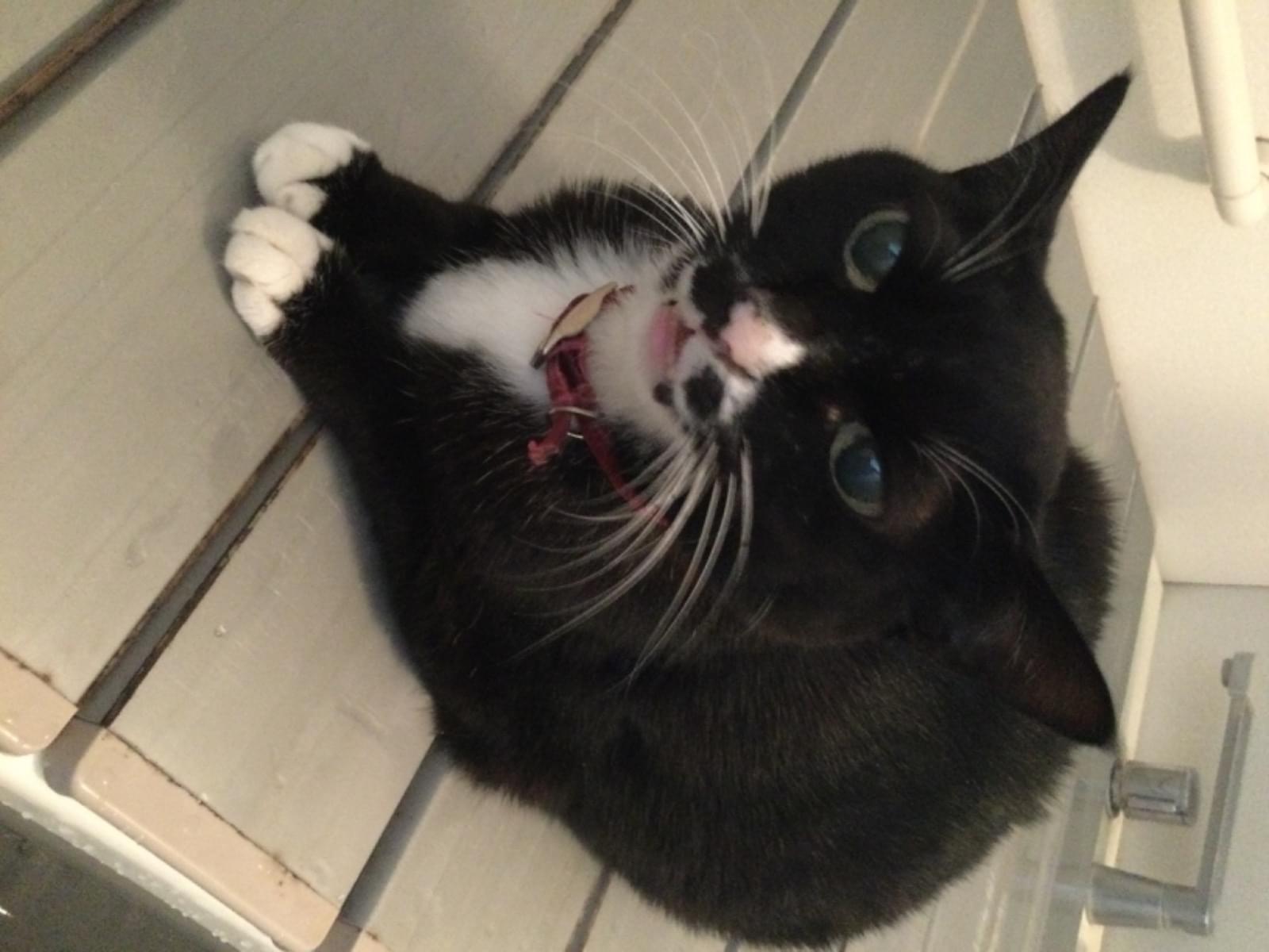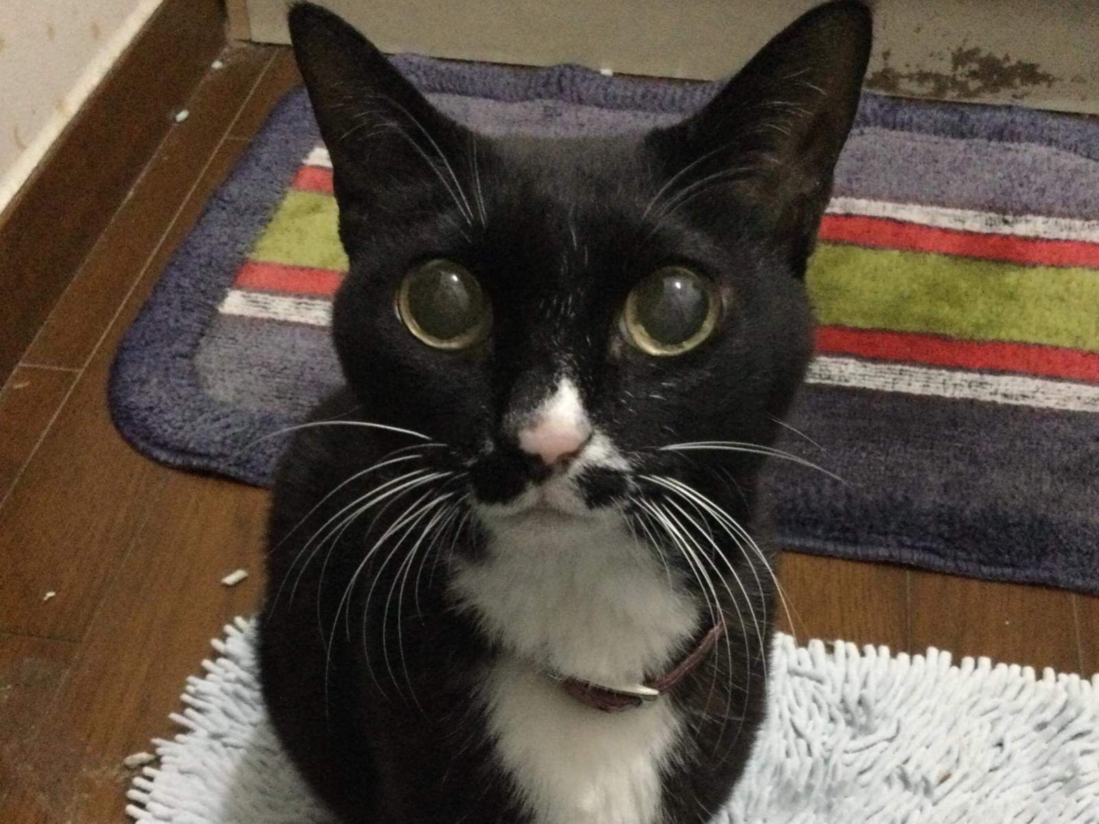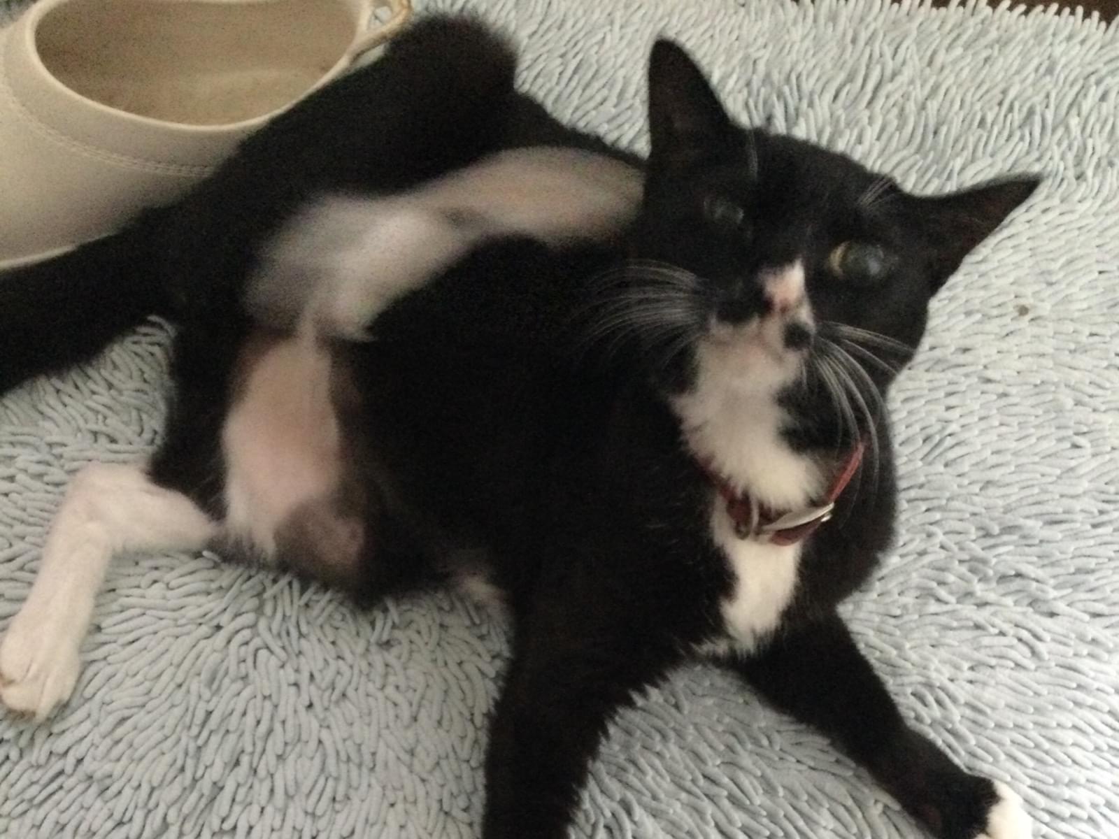 雑種でタキシード・手袋柄で後ろ足に黒い斑点模様があります