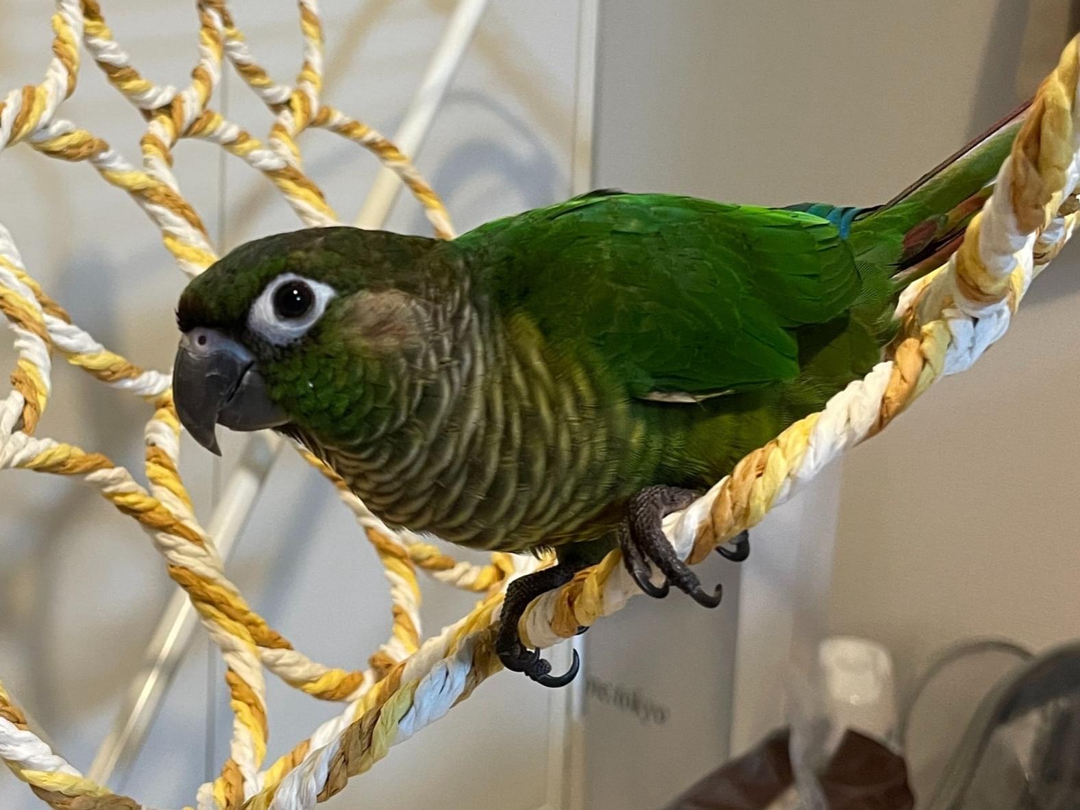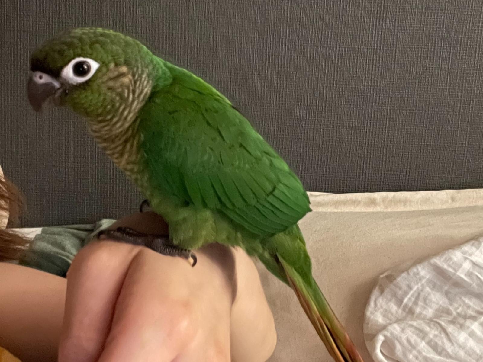 インコが飛んで電柱に座りましたが、助けようとしたおじさんにびっくりしてもっと遠く飛んでしまいました。