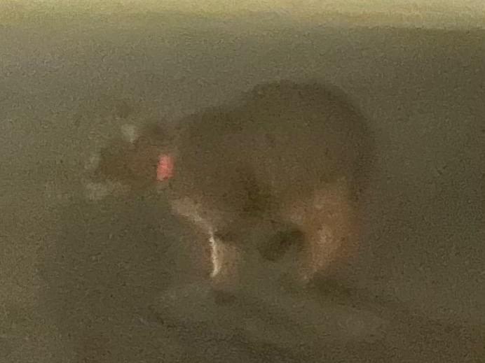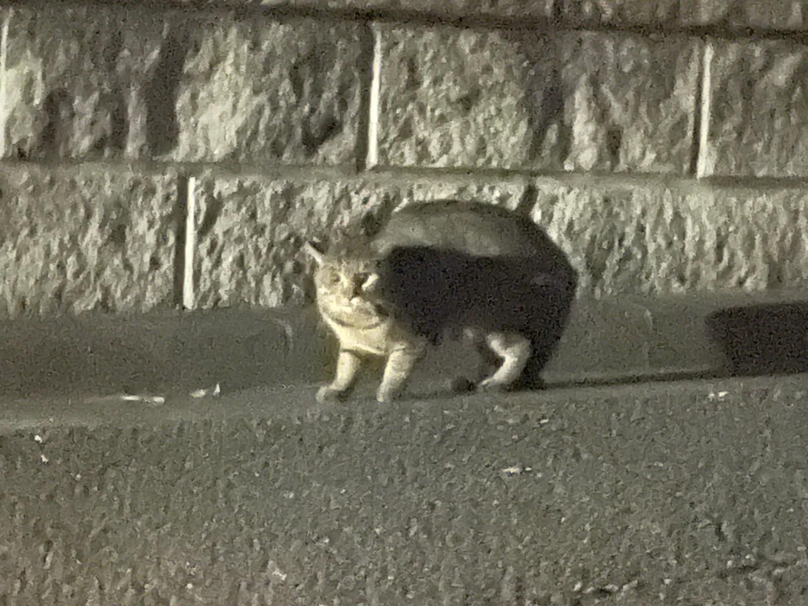 こい茶色のしましま、目はグリーン系、オレンジ系の首輪、道路に丸くなっていてその後塀に飛び乗った、動きはゆっくり、ふっくらやや大きめ