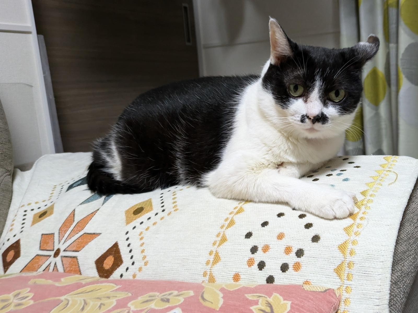 ハチワレ耳カット赤い首輪の猫探していますベランダから