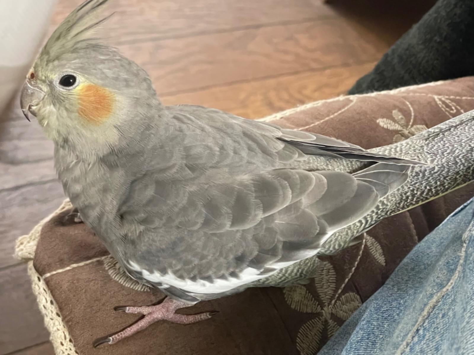 全身はグレーでオレンジのほっぺ、尻尾は縦縞模様に、黄色の羽根が混じってます。