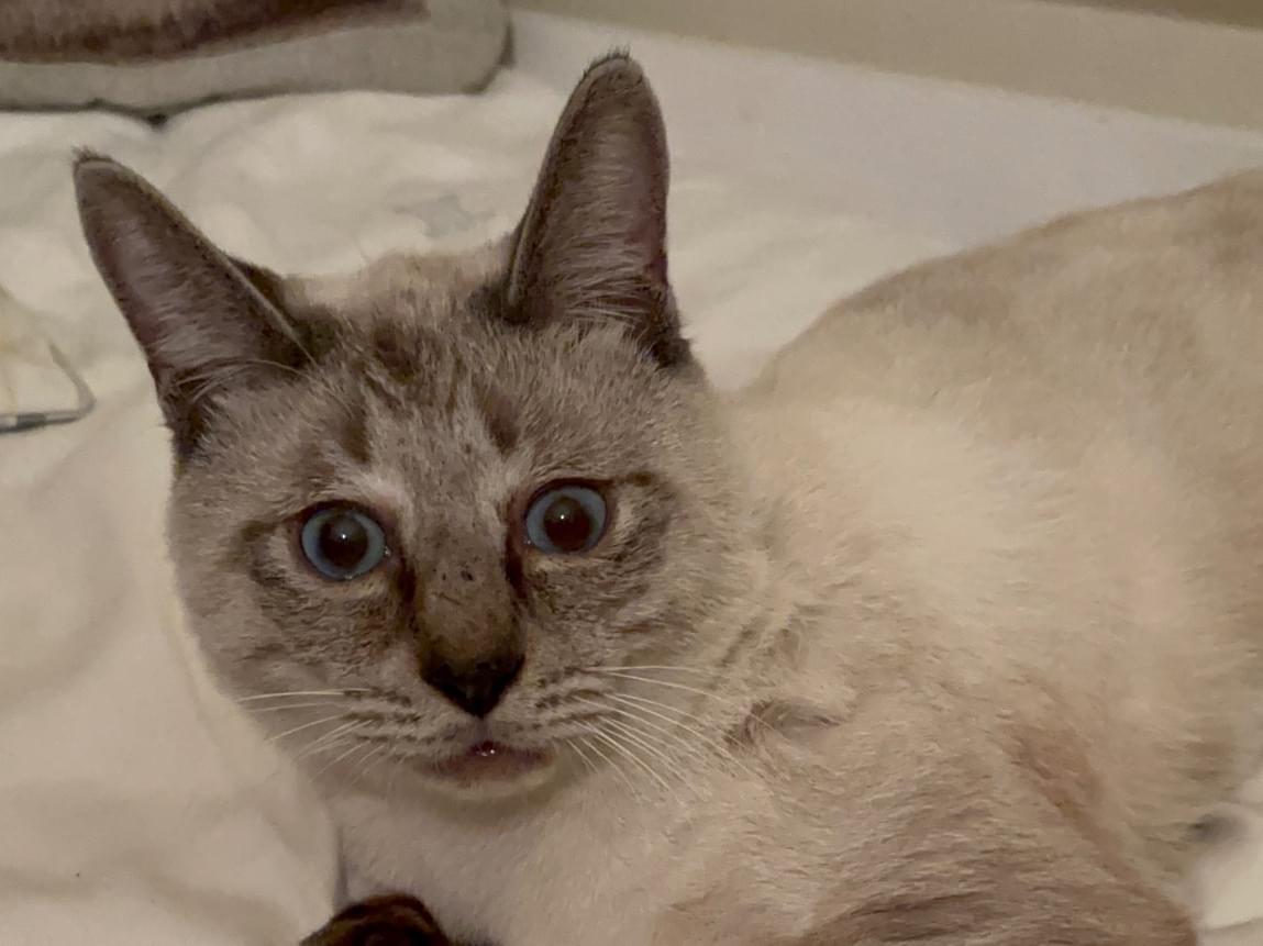 とても人懐っこいトラシャムの男の子を保護しています。目が見えないので動きが穏やかで、撫でてもらうのが大好き。きっと可愛がられていたのだと思います。室内で保護していますが、先住犬がいるので居心地が悪く、お家に戻りたいのでは?と思います。尻尾は鍵尻尾です。体重4キロ。おしゃべりキャットです。