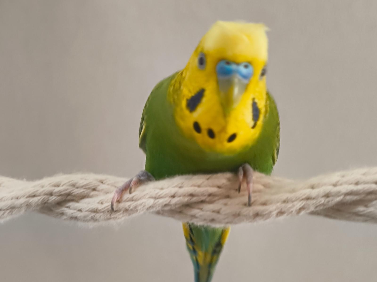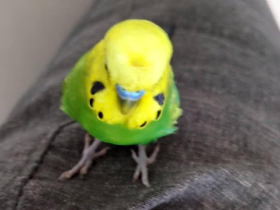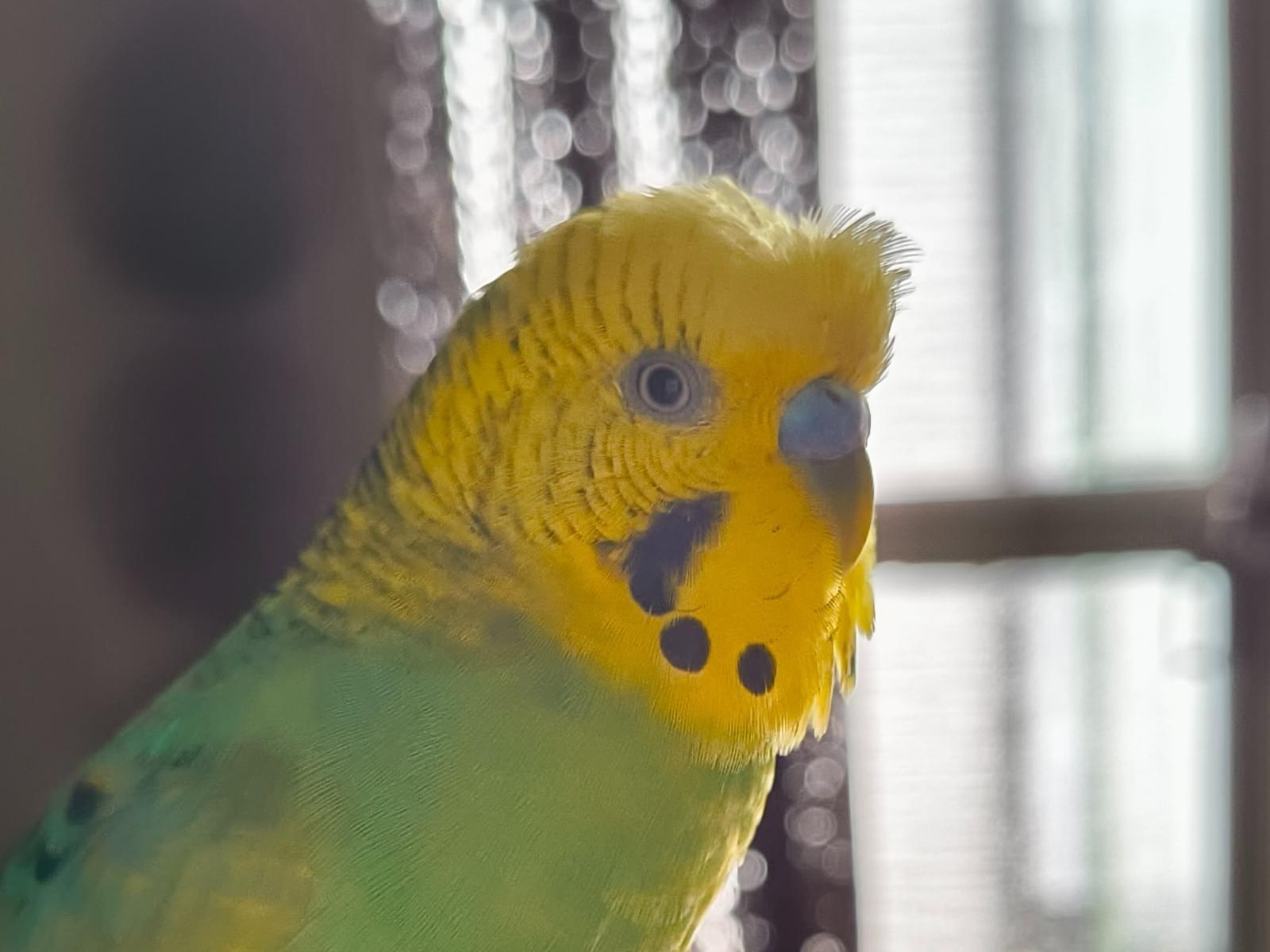 頭が黄色、体が緑色(ノーマル)の梵天セキセイインコ(※羽衣ではありません)を日光浴時に逃がしてしまいました。頭の毛が癖毛のようになっています。
