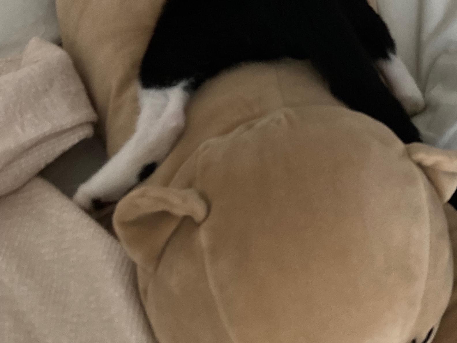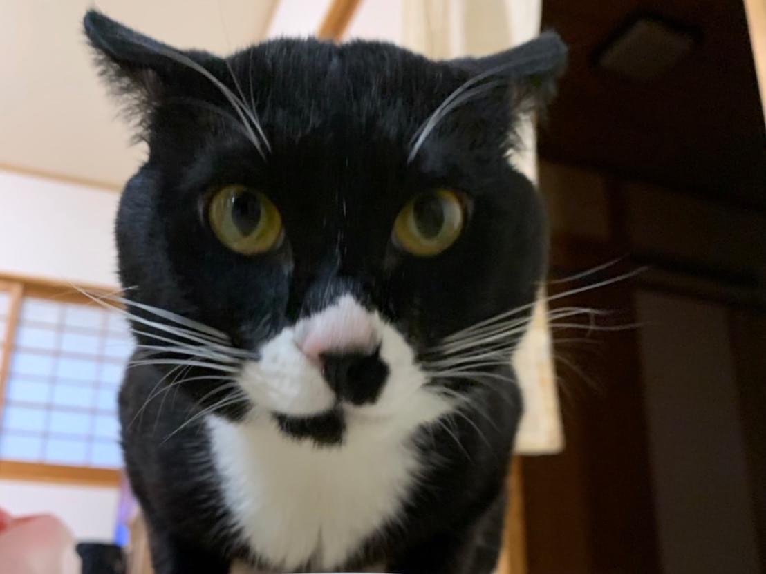 口元の模様と、ひだ後ろ足に黒い模様があります。