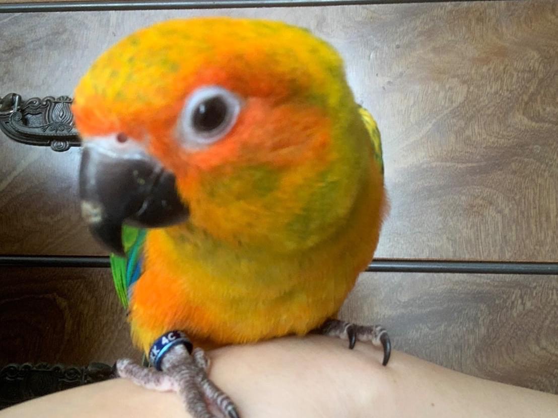 オレンジと黄色と緑の中型のコガネメキシコインコです。