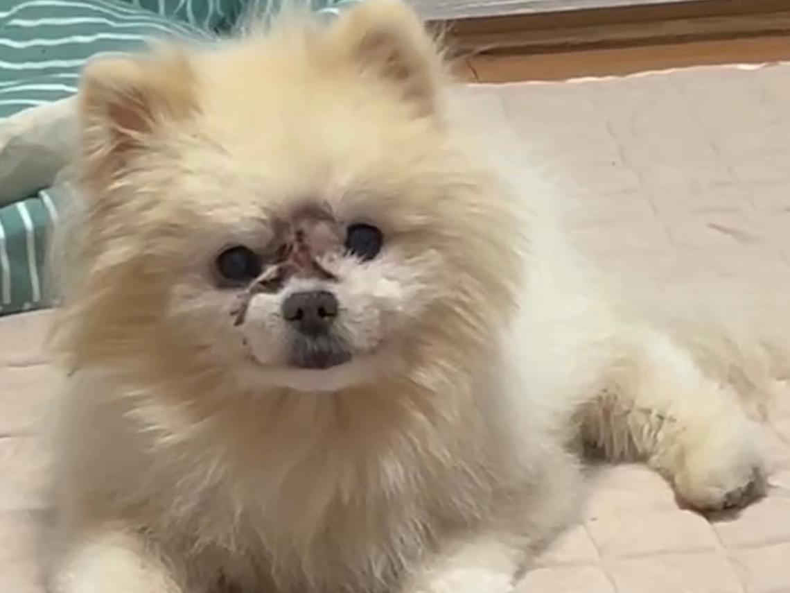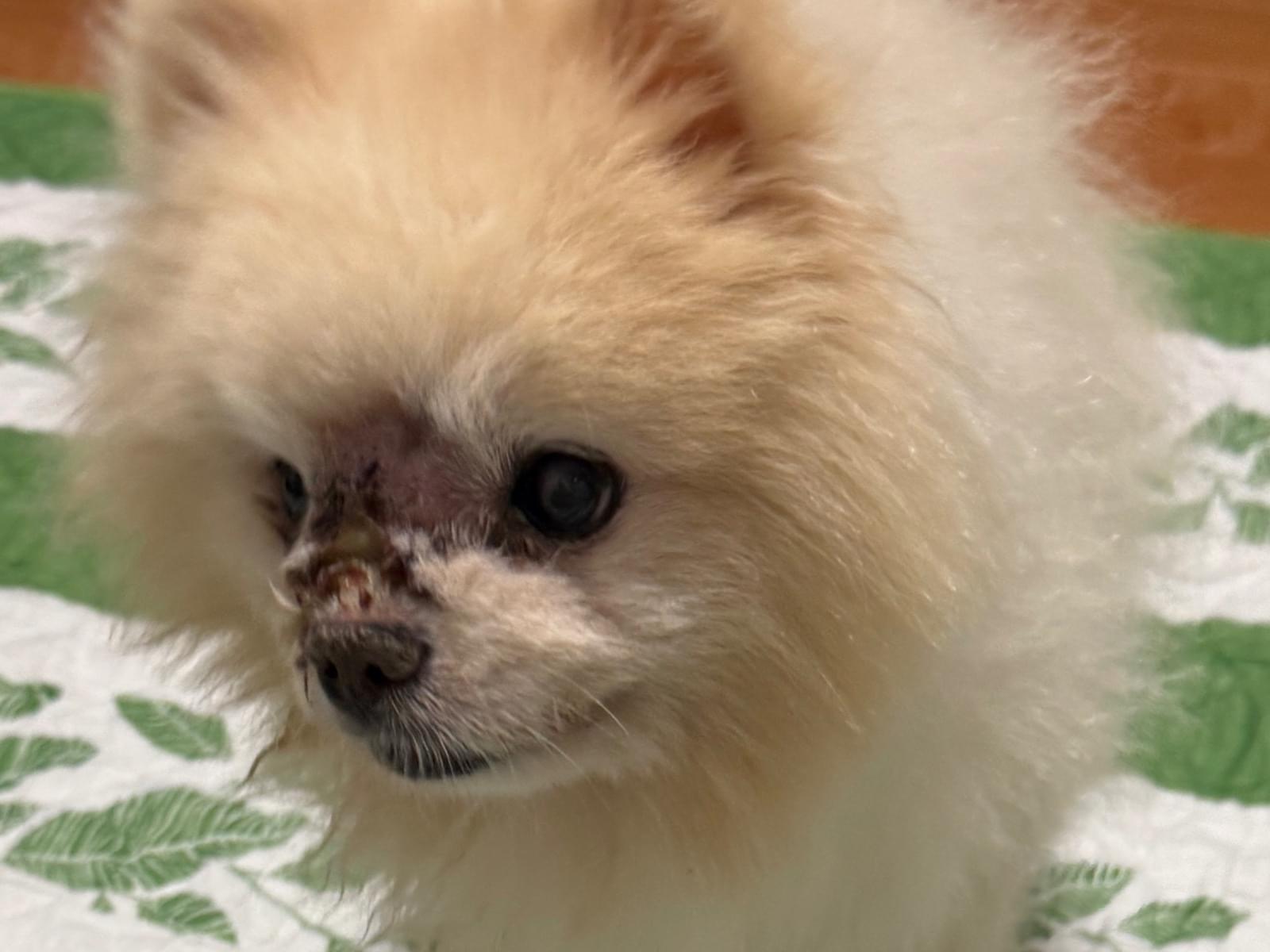 鼻の上、目の間辺りに腫瘍があり、検査のため少し毛を剃っています。