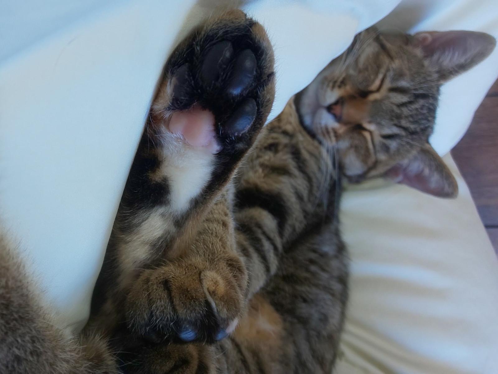 強いて言えば、右後ろ足の肉球だけがピンク色で、他は黒色です。