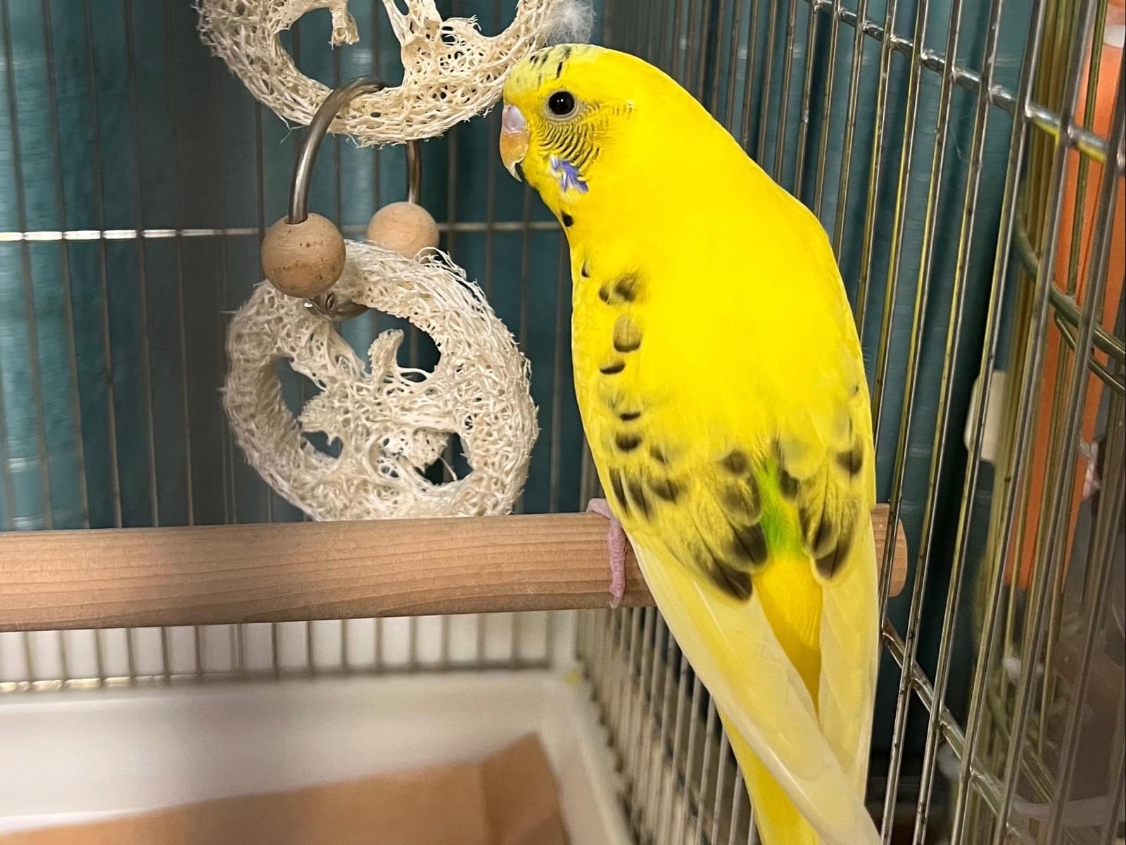 黄色に黒い模様の入ったセキセイインコで、お腹の下、お尻のあたりに少し緑色が入っています。