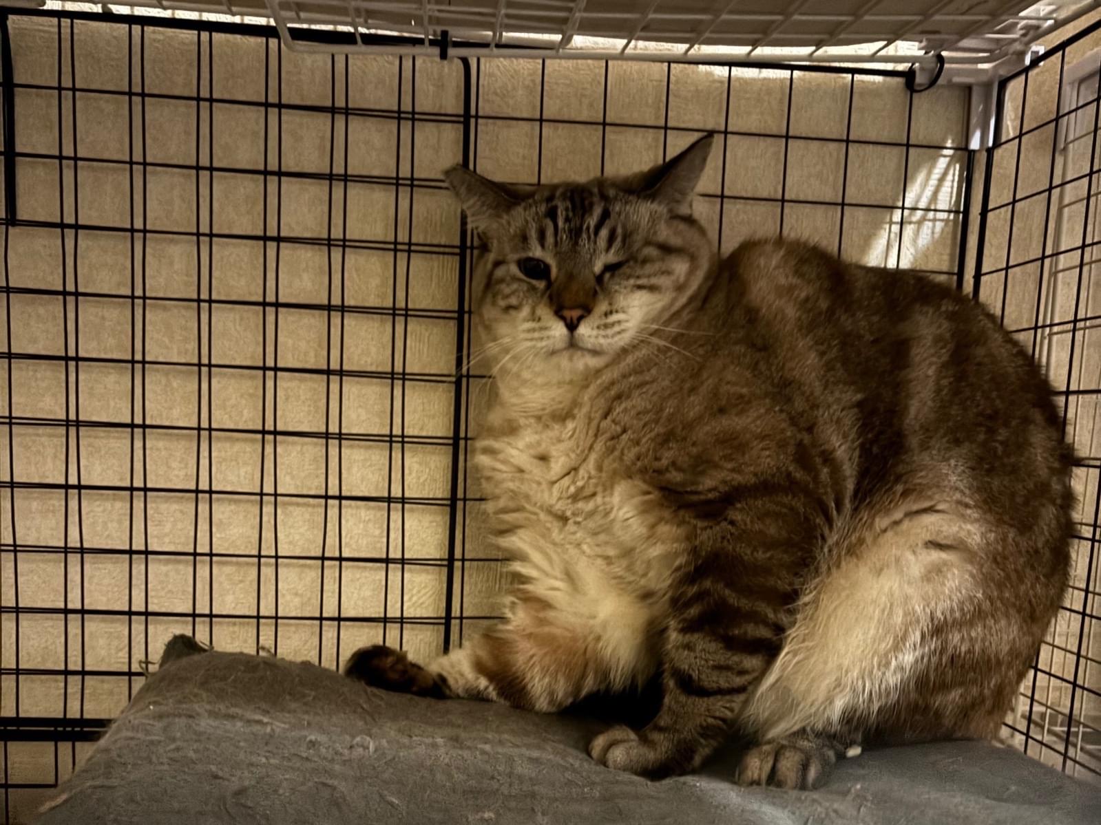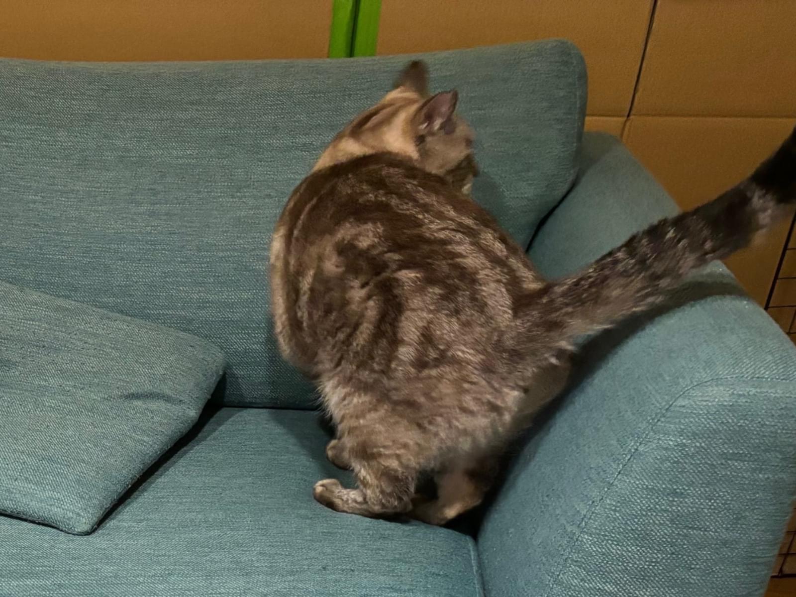 大柄でかなり臆病な性格です。しっぽは長く黒と灰色が混ざった感じで、瞳の色は水色です。ぱっと見、かなりたぬきに似ています。