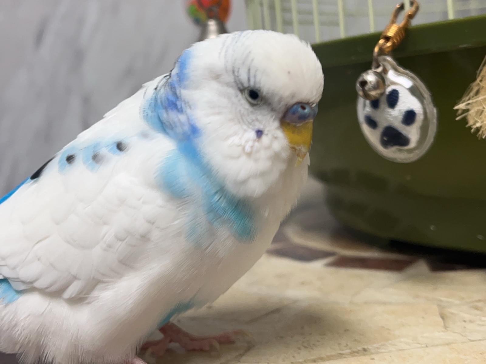 白にまだら青のセキセイインコです