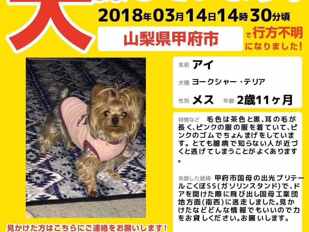 2018年3月14日、山梨県 甲府市国母の出光プリテールこくぼSS(ガソリンスタンド)で、車のドアを開けた際に犬が飛び出して迷子になってしまいました。