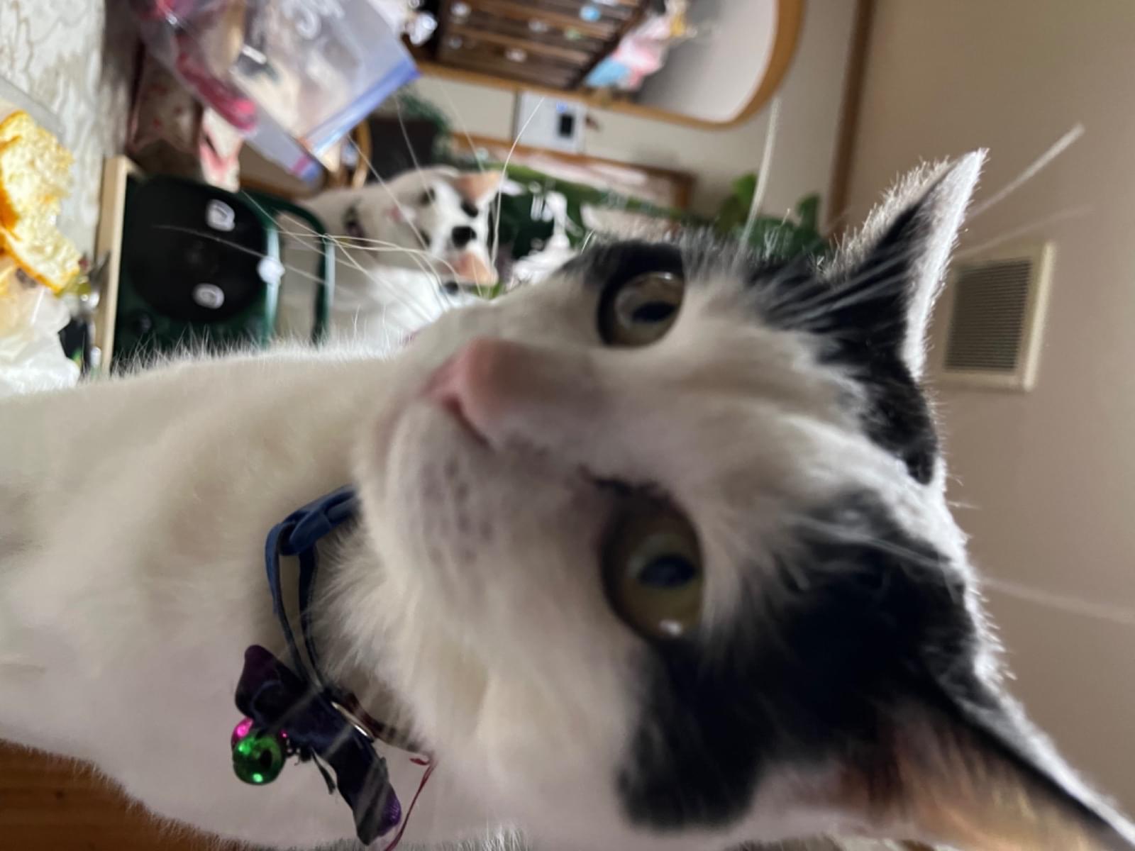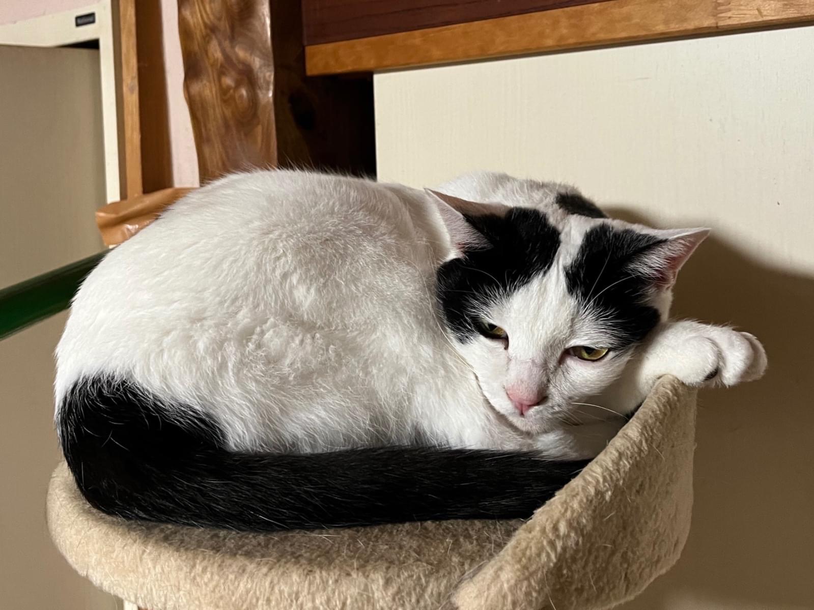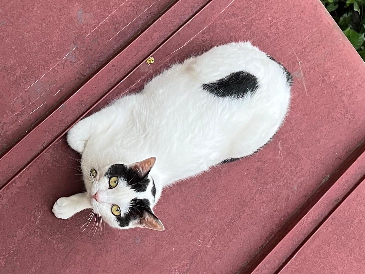 実家の白黒猫です。両耳の下としっぽと背中の右下に黒の模様があります。ご飯を食べずに2日間くらい出かける事がありましたが1週間戻ってこなくなりました。お腹がすくと一気に食べてから、ずーっと寝ます。他の猫にも興味を持つ持つのでどこかお友達猫ちゃんと遊んでるといいのですが…