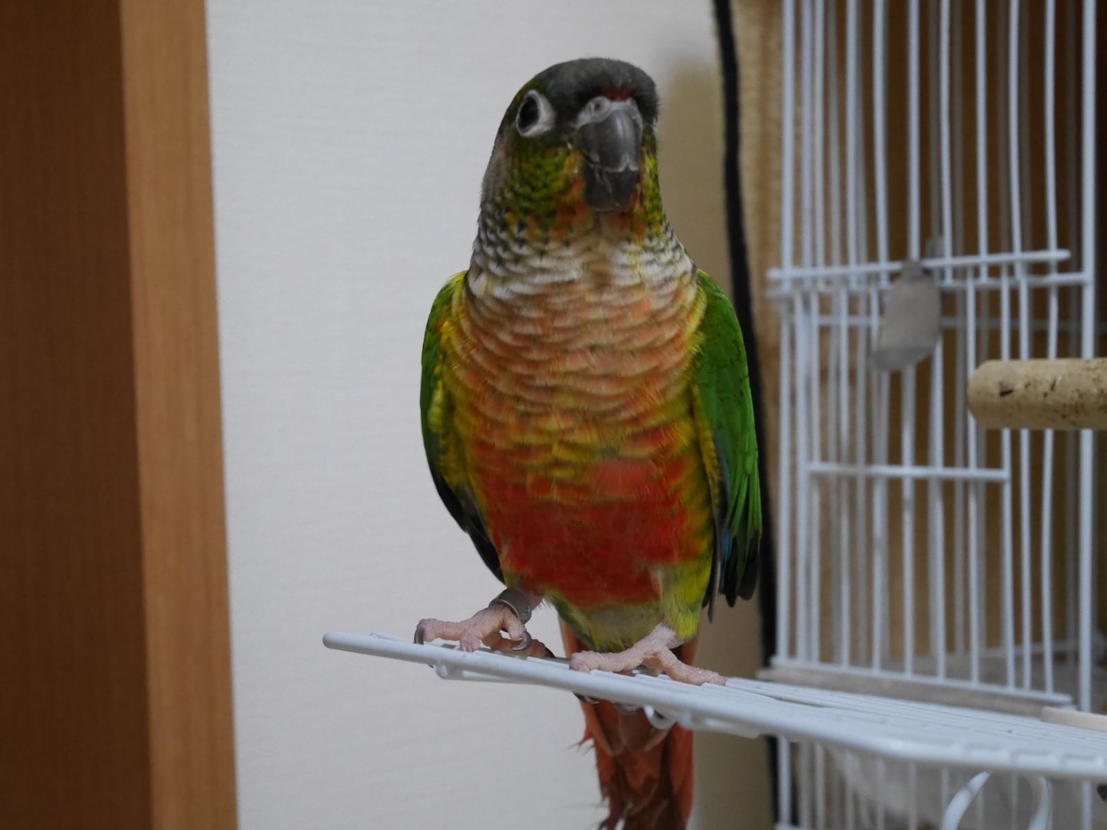 体全体は鮮やかな緑色ですが頭はグレーで尻尾は長く赤色をしています。首元は鱗なような模様で、目がとても大きく太く白いアイラインが特徴です。