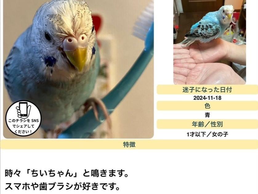 ホーム迷子鳥三重県青いセキセイインコを…青いセキセイインコを探しています管理編集するポスター掲載終了最終更新日時:2024/11/21 16:24写真情報用件迷子名前ちい性別メス年齢1歳場所三重県 桑名市発生日時2024年11月18日(月)飼い主飼い主説明・セキセイインコ ・ブルー ・スマホ、歯ブラシが好き ・時々、「ちいちゃん」と鳴くことがある連絡先URLx.com/MMK20111125掲示板情報交換のための掲示板です。ユーザーからの情報提供、オーナーからの連絡などにご利用下さいませ。まだコメントはありません。トピックを作成する
