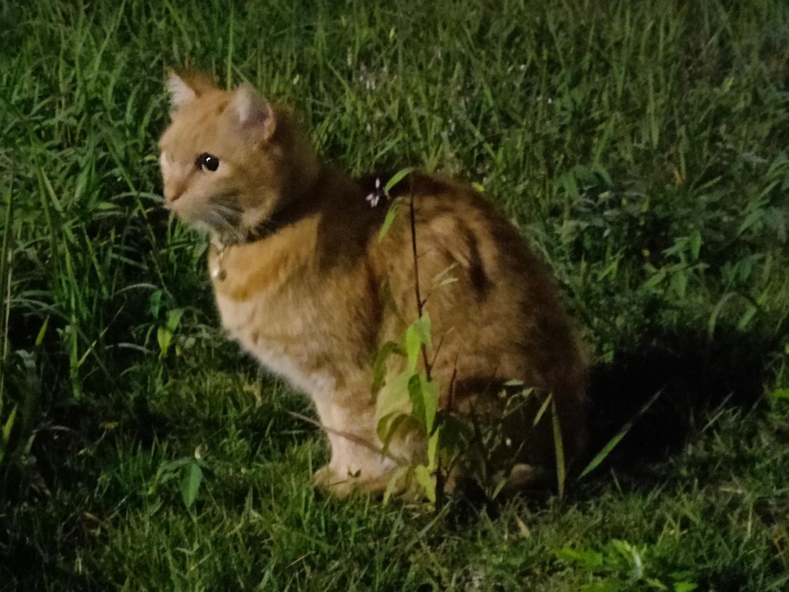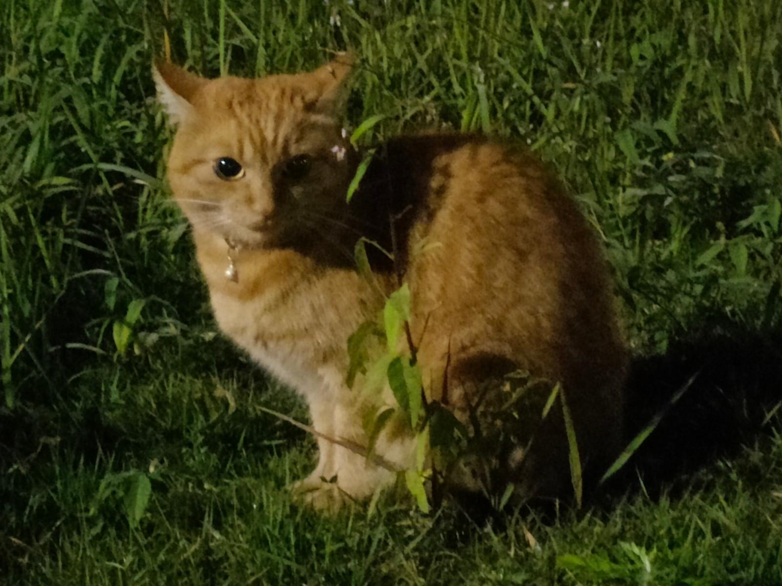 茶色の成猫を2,3日前から見かけます。鈴を付けているので飼猫と思われます。首輪の色は暗くて見えませんでした。