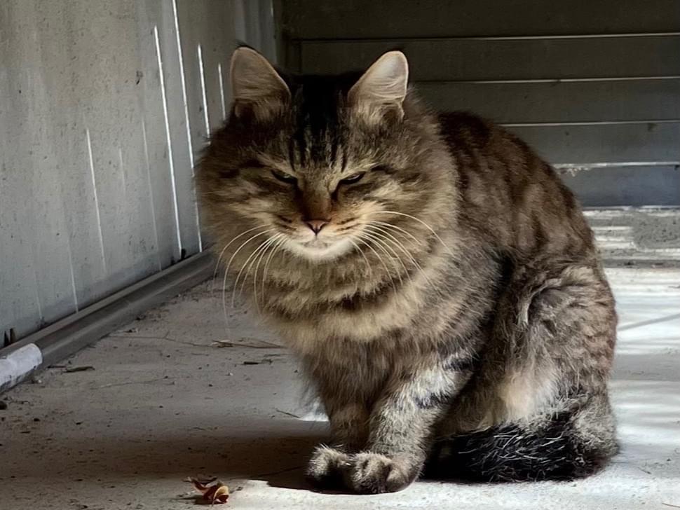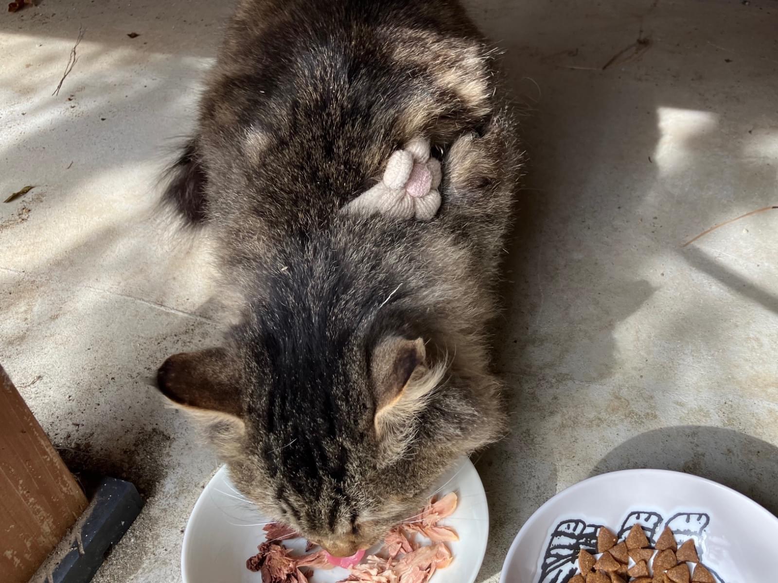 長く放浪しているようで、人慣れしておらずゴミをあさっていたりします。古いハーネスの残骸を身につけています。一度保護して警察や保健所に連絡している最中、扉をこじ開けて逃げて行ってしまいました。