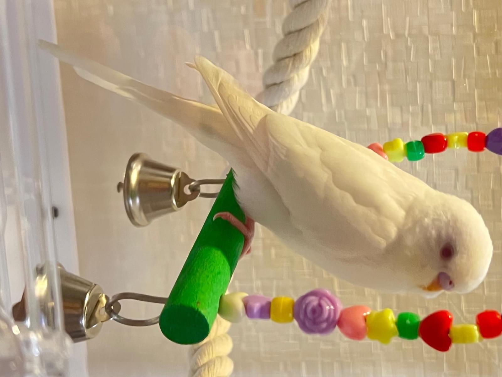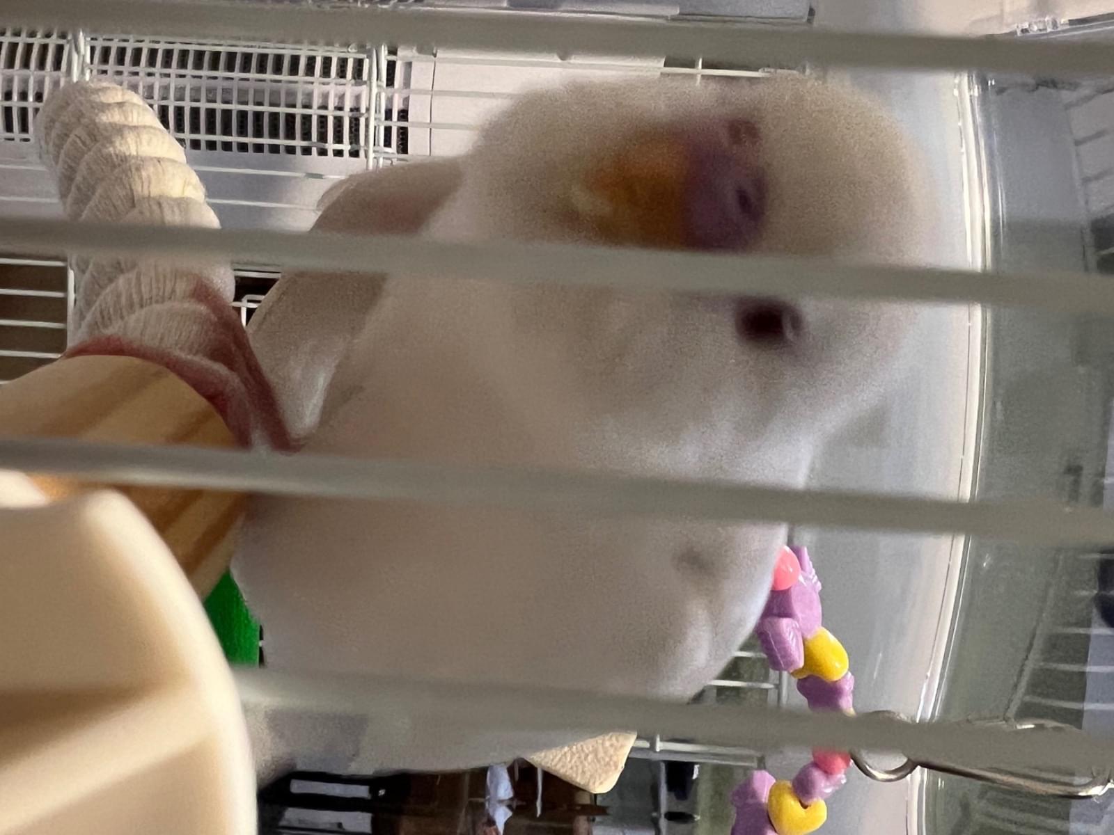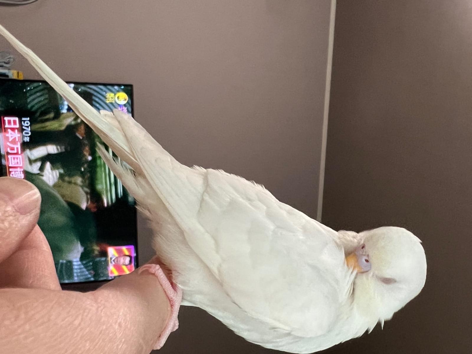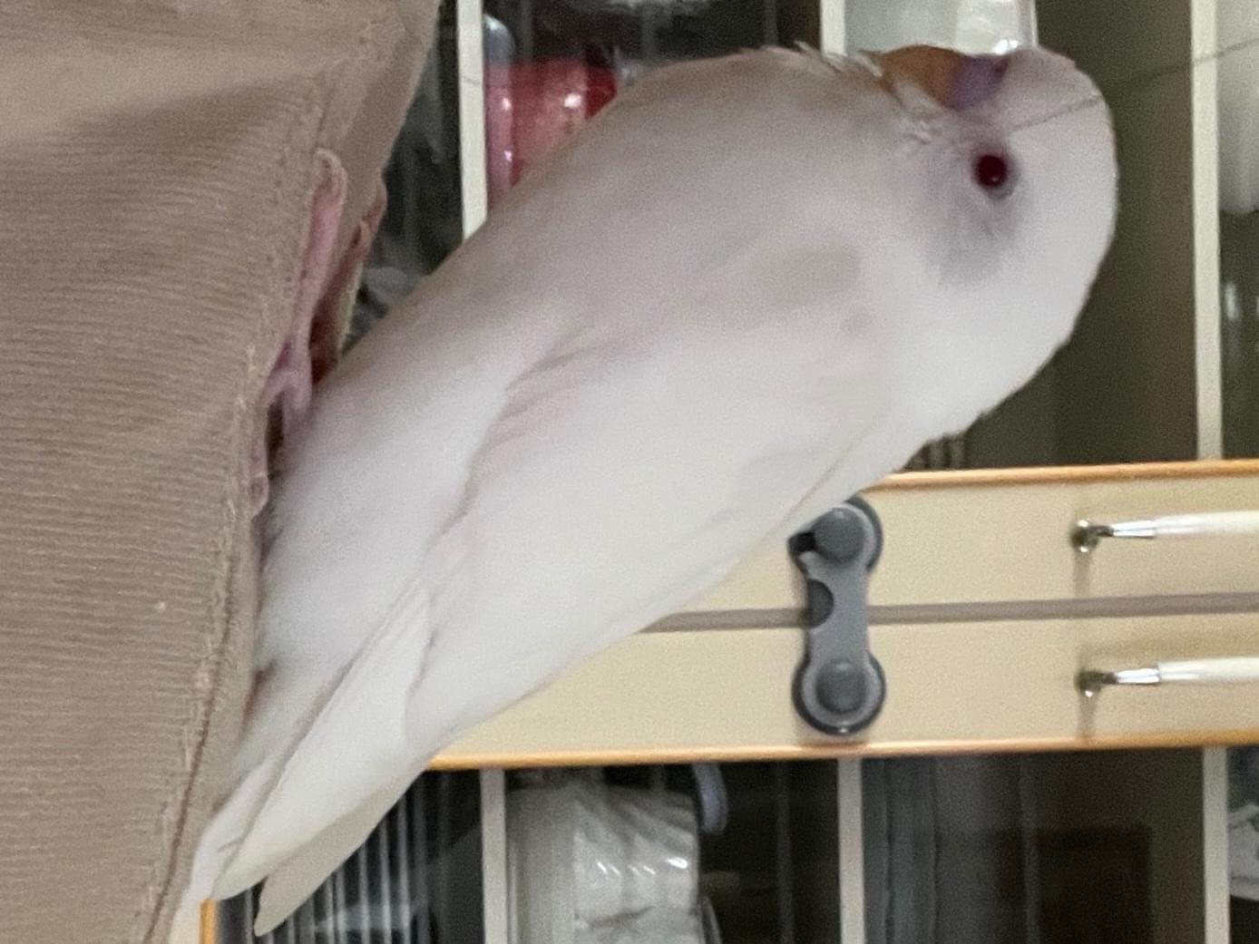白のアルビノ赤目、風切り羽はカットしていません。体型はスリムで、体重は35gです