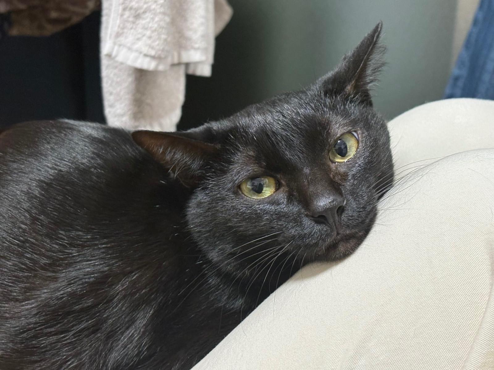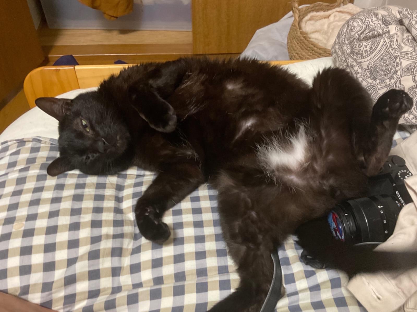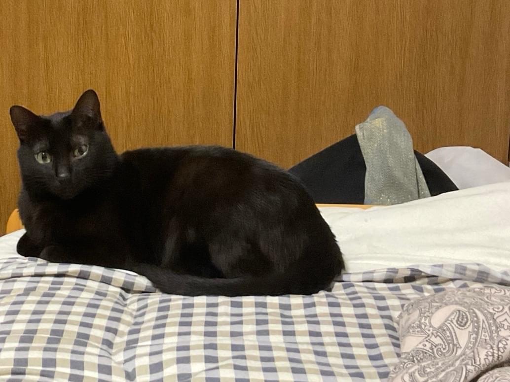 黒猫、大きい、顔が小さい、臆病で人と車には怖い、お腹には白い毛がある、首輪が付けてない、去勢された。