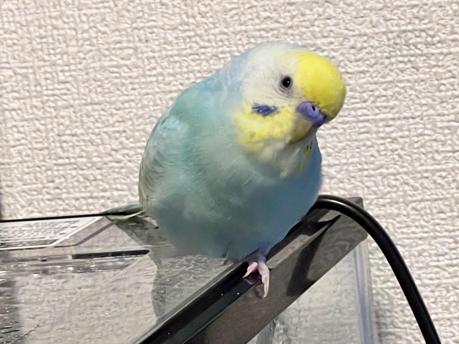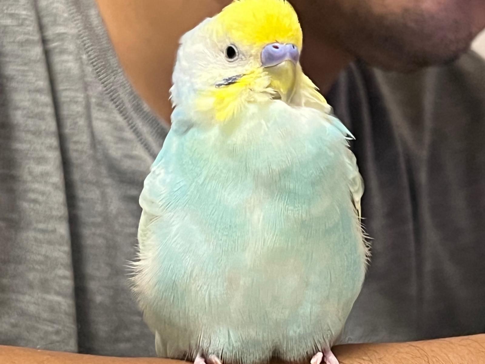 頭が黄色く体は水色のセキセイインコ