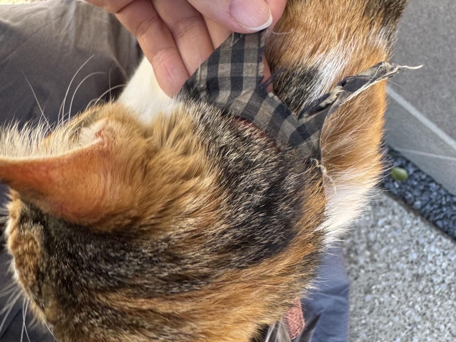 縞三毛?の女の子。赤い首輪に茶色のチェックのスカーフが付いています。