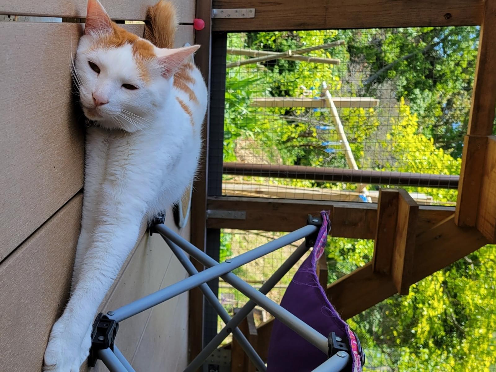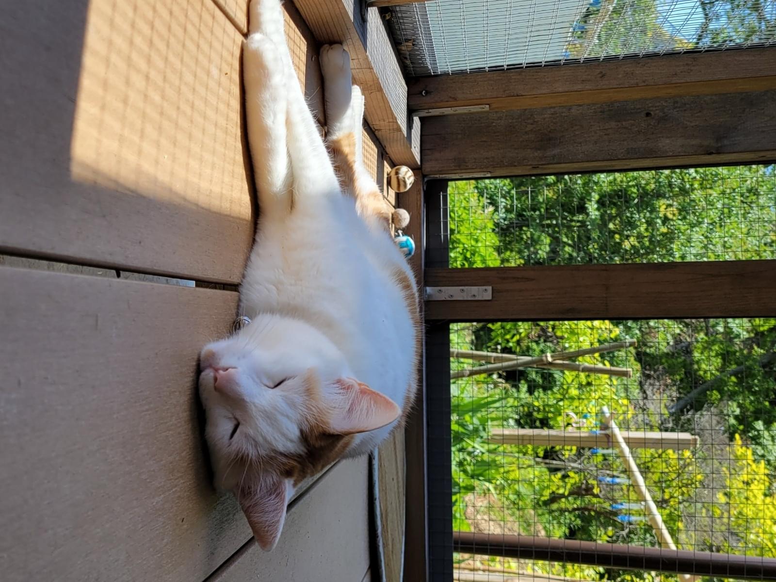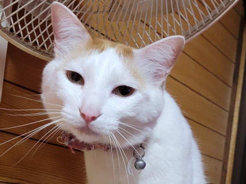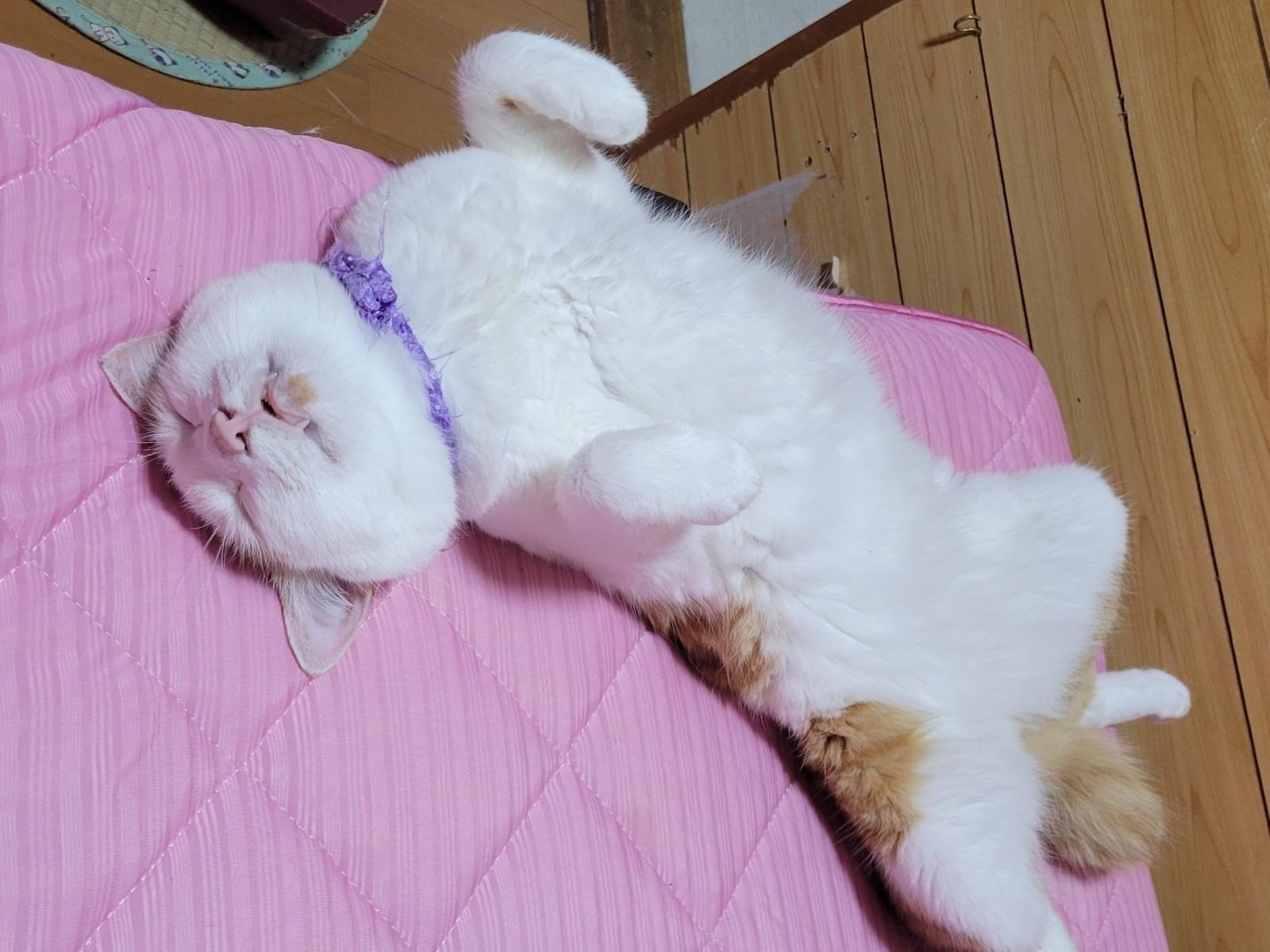 紫色の首輪に 透明の お名前キーホルダーがついています。