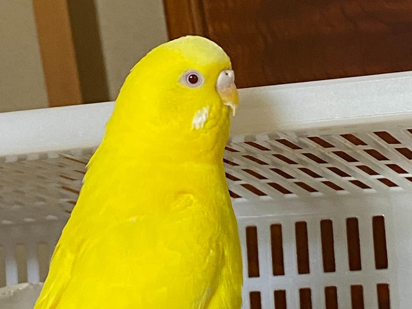 黄色いセキセイインコ(ルチノー)が迷子になりました。鼻はピンク色です。性格は好奇心旺盛でおもちゃで遊ぶのが好きです。