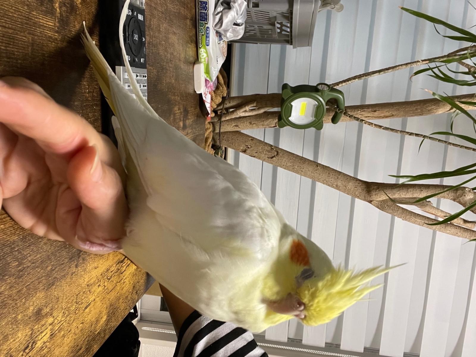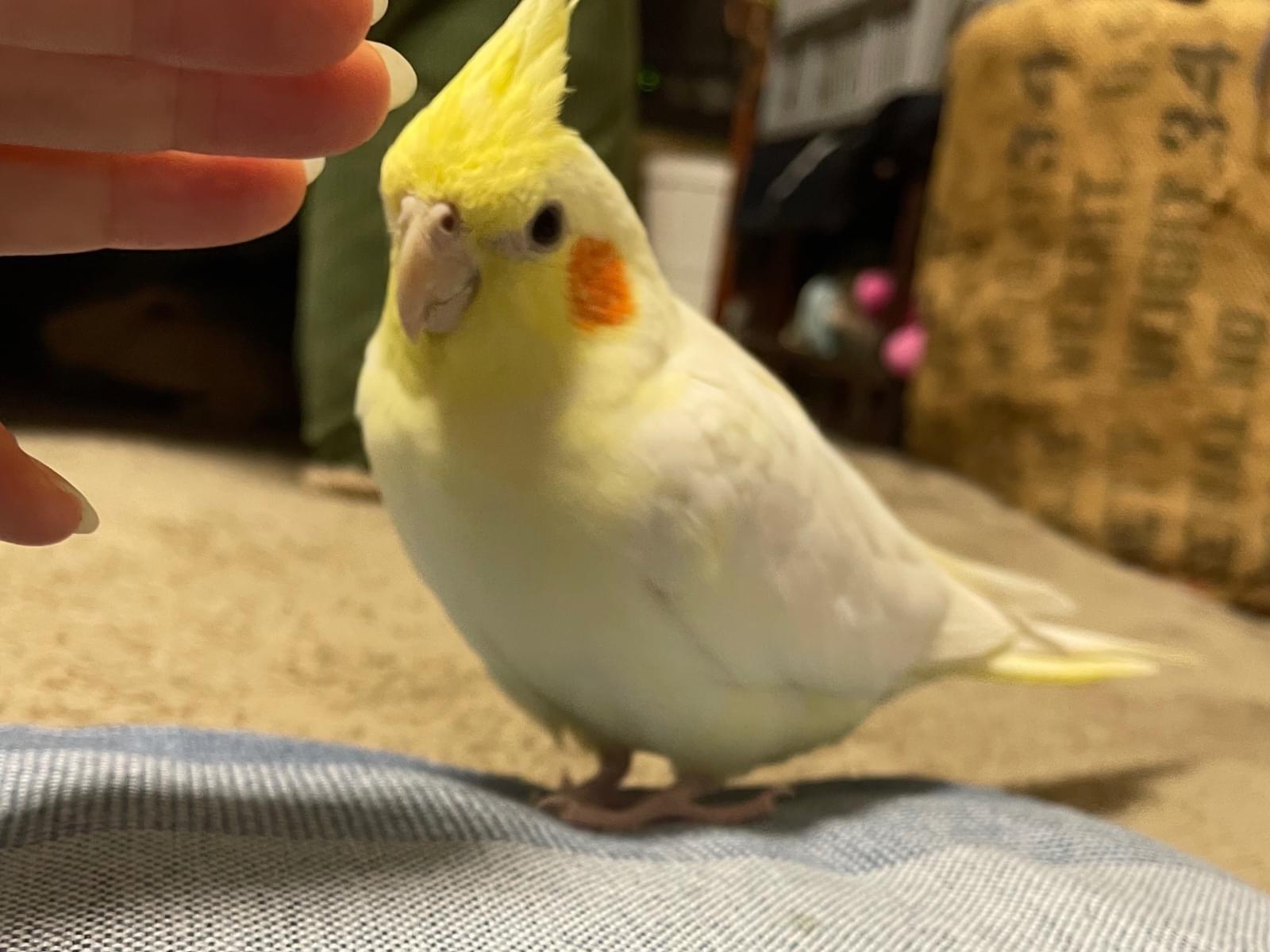 オカメインコ  ルチノー  体は白色。ほっぺはオレンジ色。頭とシッポは黄色です。人に懐いていて肩にずっとくっ付いていました。きっとにーにーと呼べば肩に乗ってきてくれると思います。どーか無事でありますよーに。