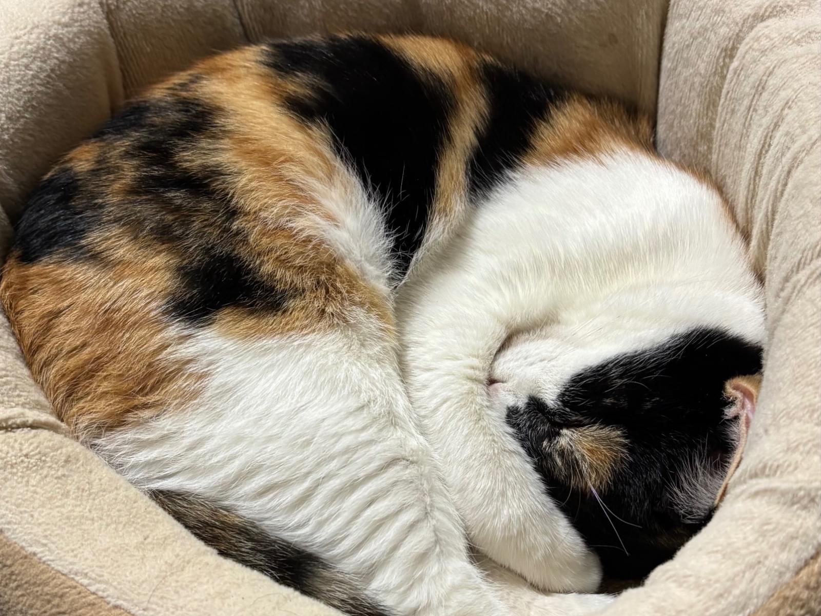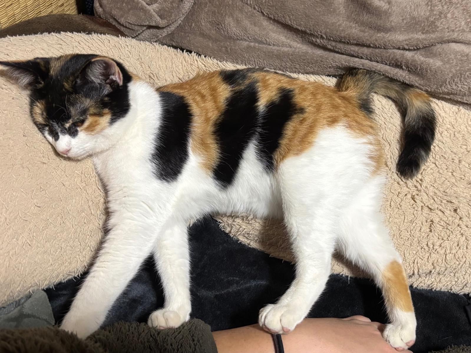 上半分がミケがらで下半分が白い柄で、尻尾は長いです。