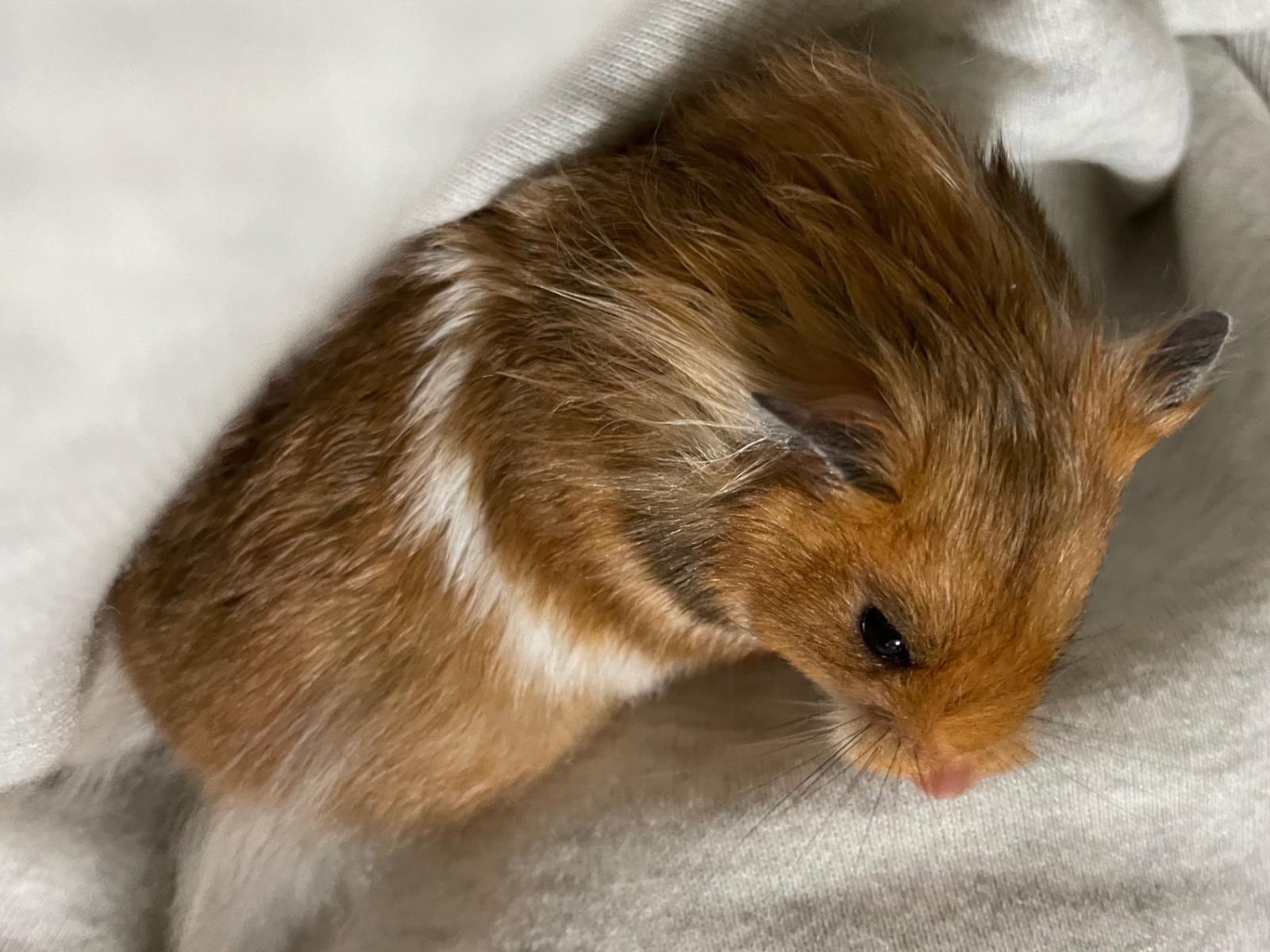 茶色と白のマダラ模様で、女性の手のひら2つ分サイズです。ゴールデンハムスターですが、モルモットより小さいサイズでハムスターの中では大きめです。お尻部分に束で2本長い毛が生えてます。警戒心強めですが、人に慣れるのが早いです。噛むこともありません。温厚な性格です。