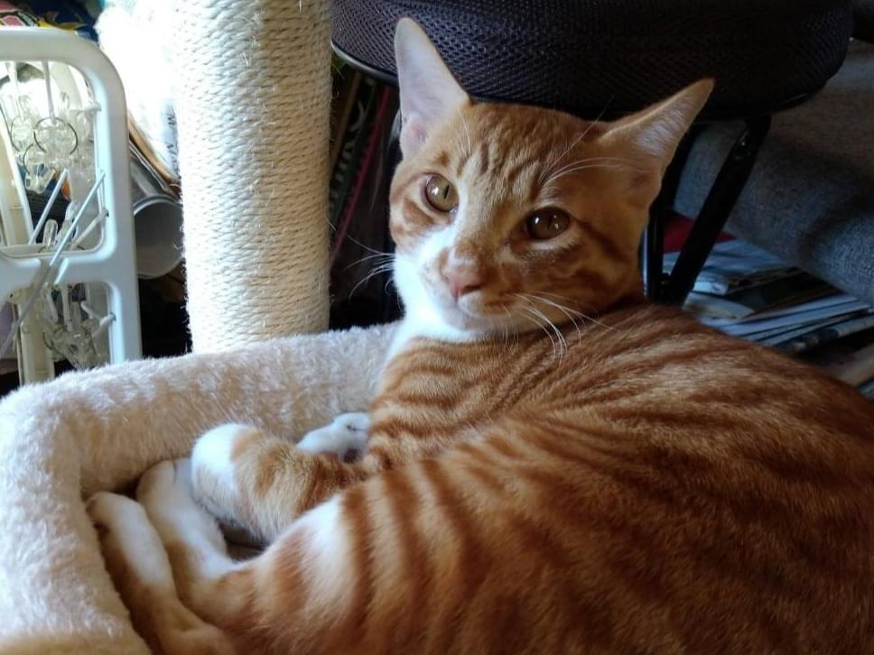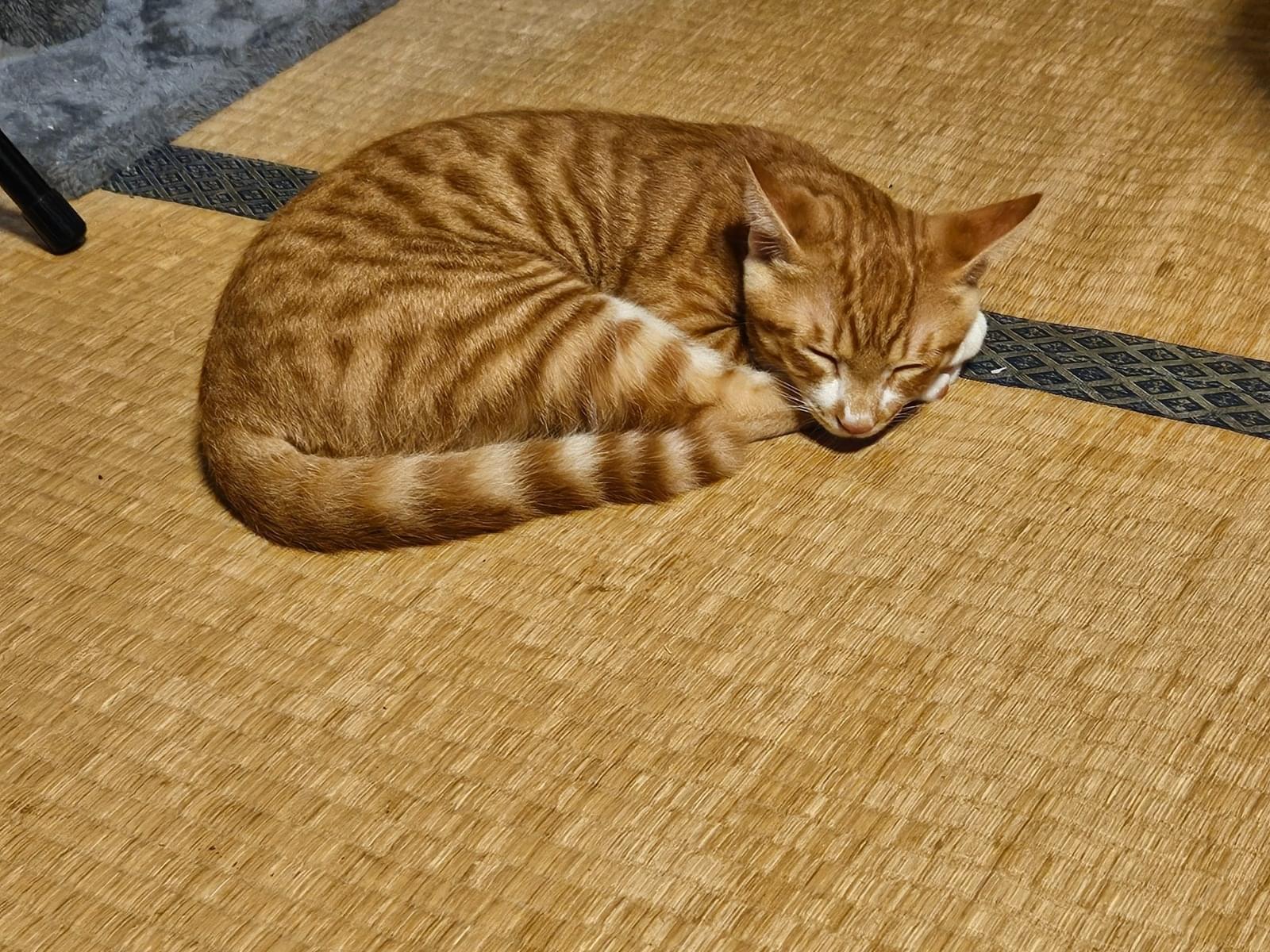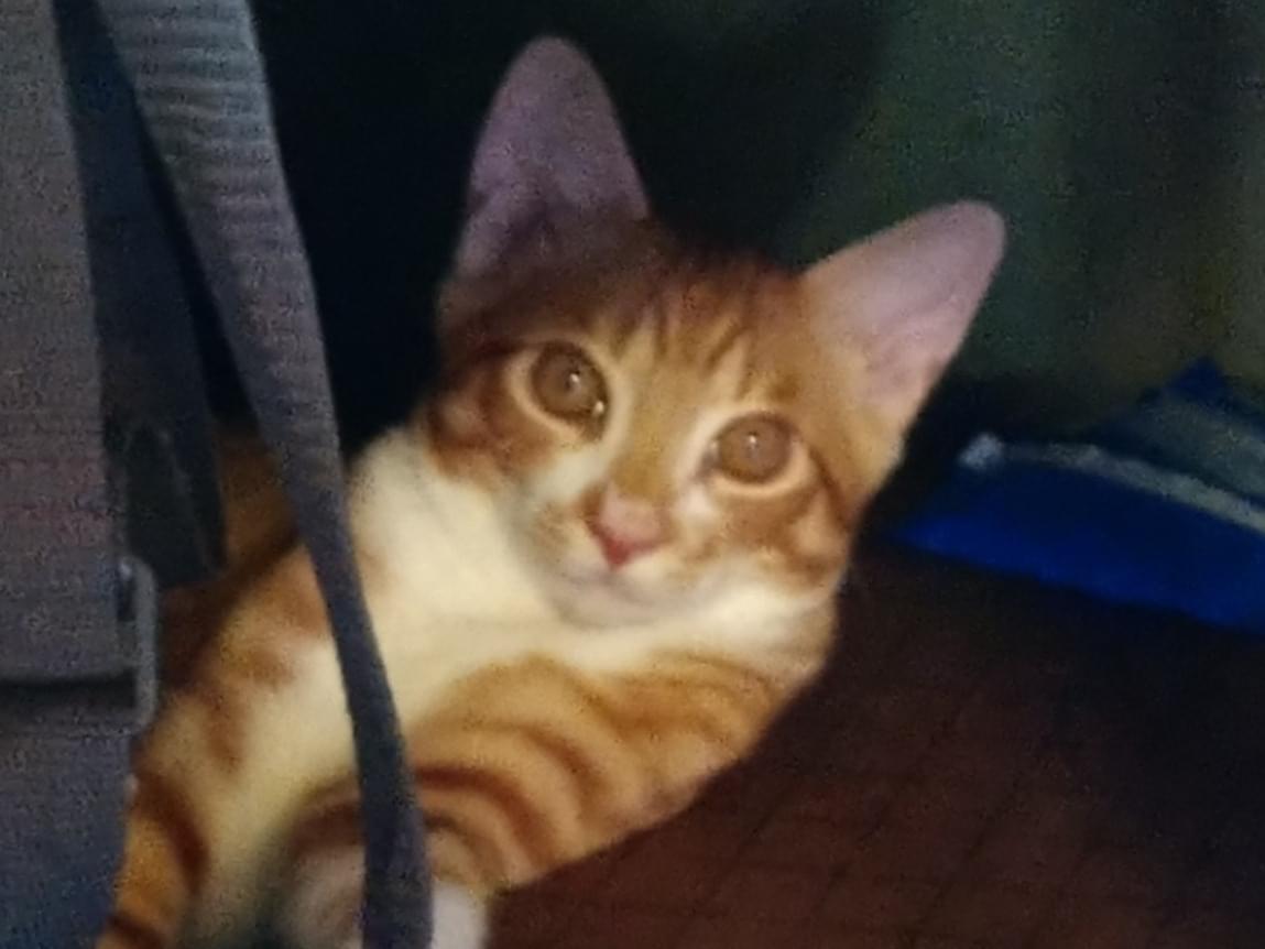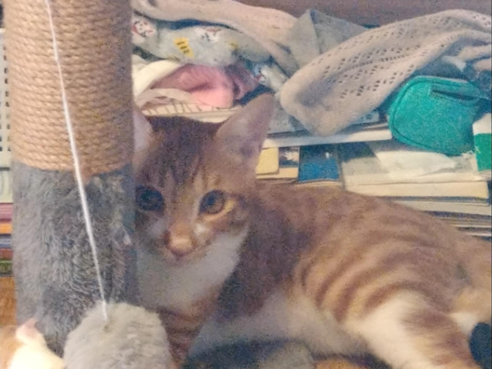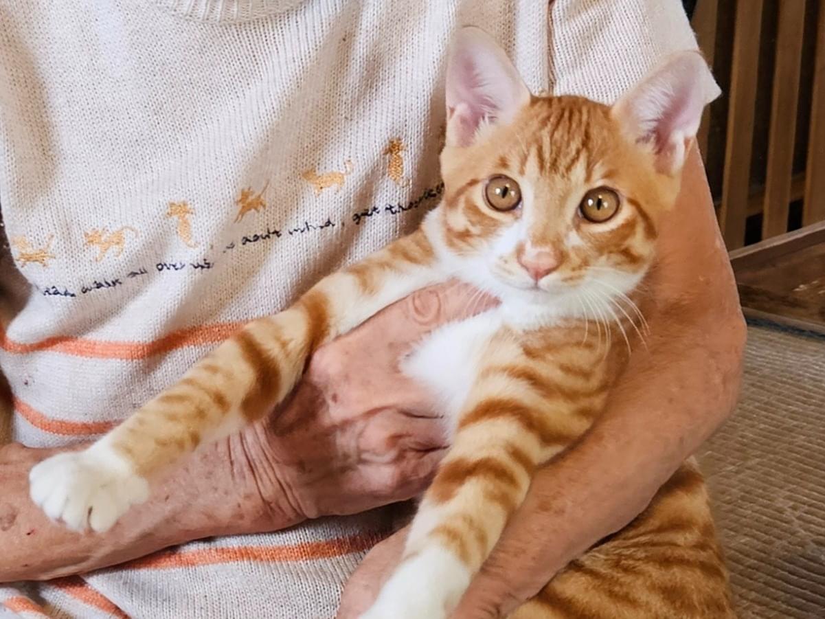 しま模様がくっきりしていて、しっぽが長く、耳が大きい男の子です。人見知りで食いしん坊、去勢手術前です。