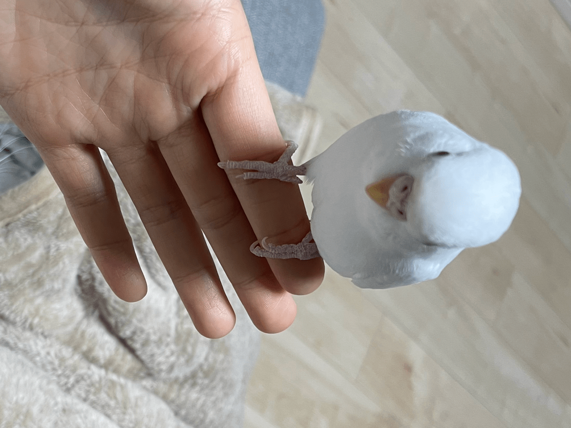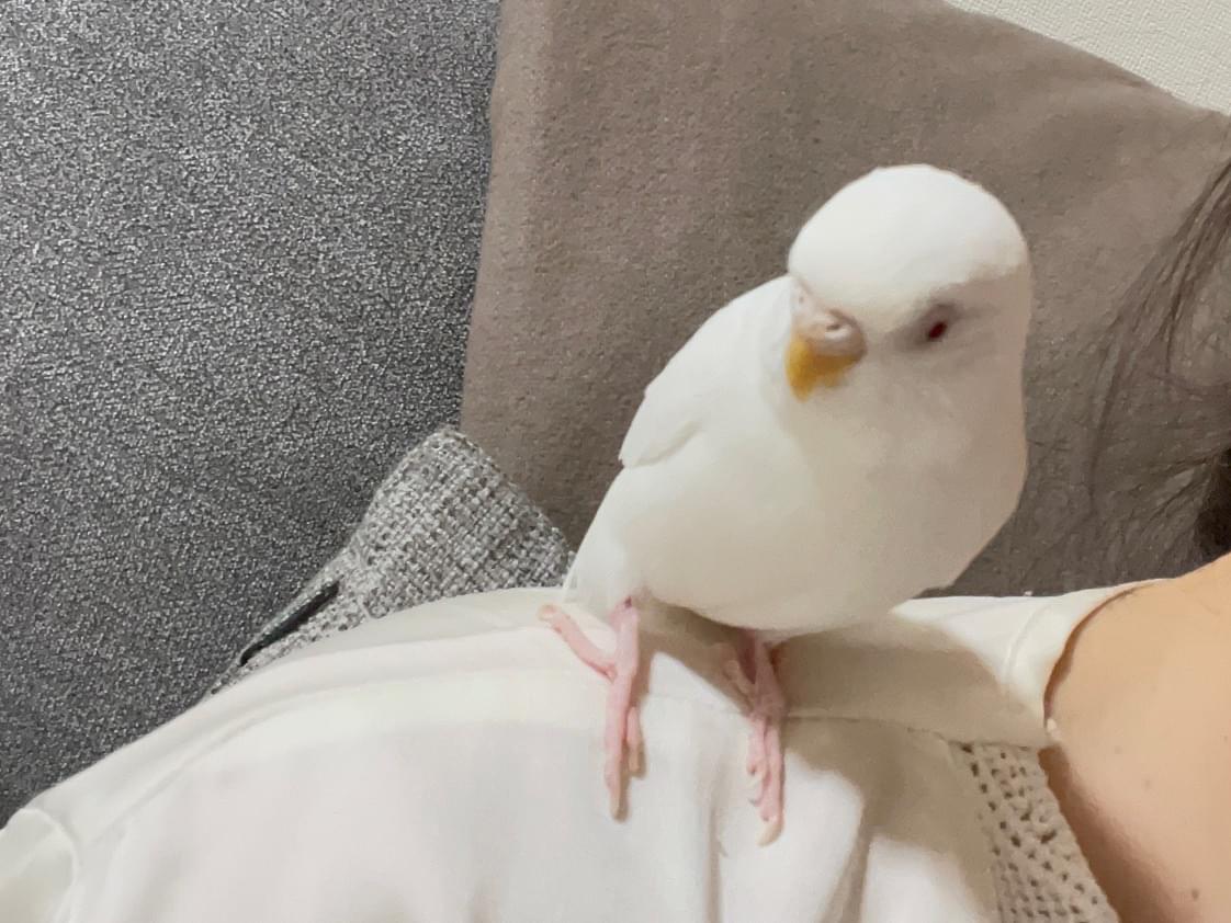 特徴:セキセイインコ(体は白色、目は赤色、メス、2歳6ヶ月)