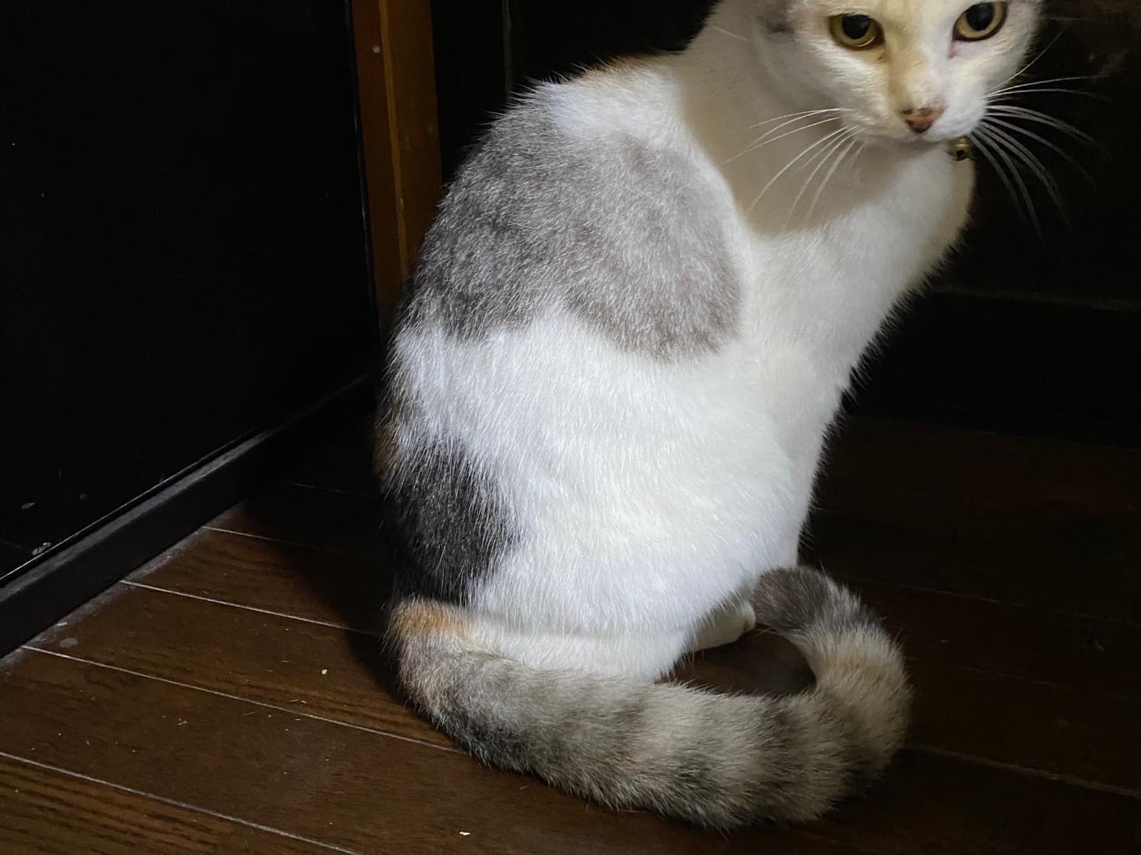 見た目の特徴は、白が多めの三毛猫です。色素も全体的に薄めで、尻尾は白とグレーの縞模様です。
