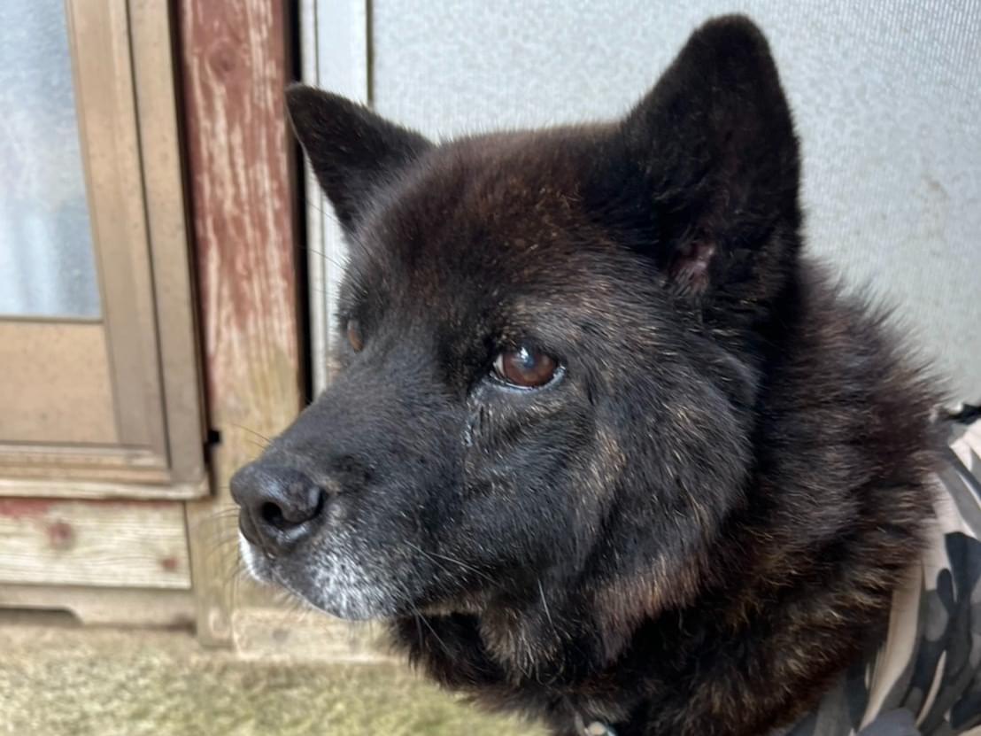中型犬、12歳で甲斐犬が混じった雑種です。黒色で迷彩柄の服を着ています。青い首輪と赤いワイヤーがついたまま居なくなりました。ワイヤーを繋いでいた所が外れたようです。