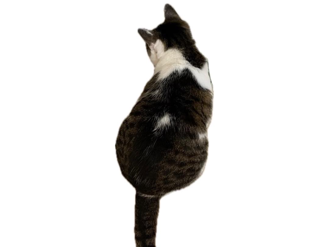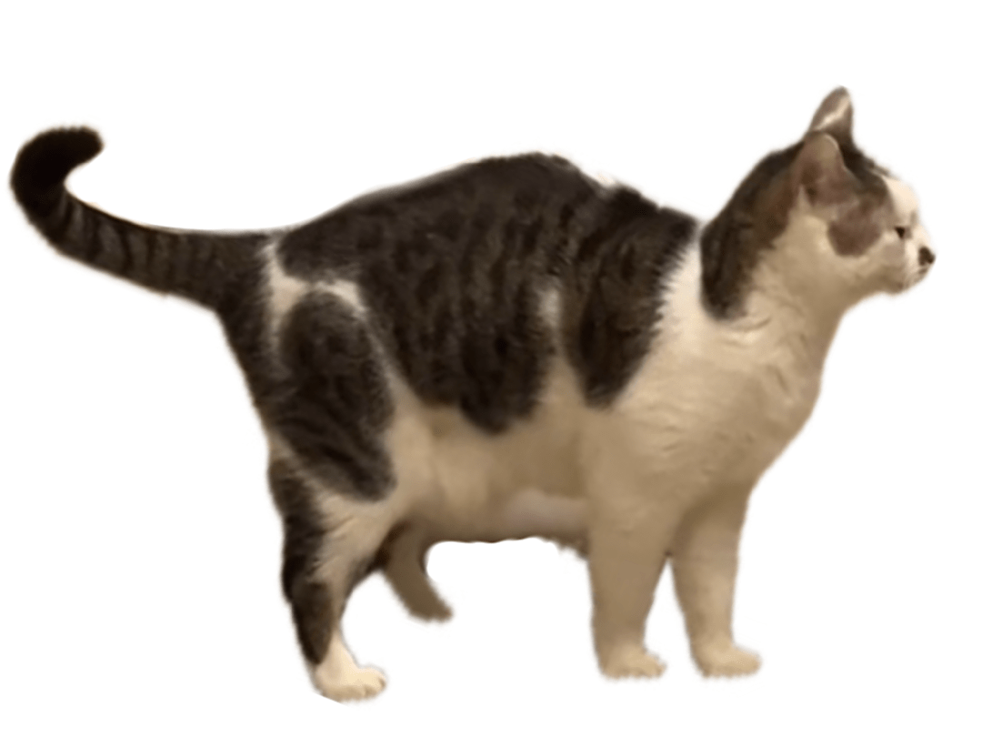 しっぽは長くまっすぐ。体型は太めでお腹の皮が垂れてます。顔は小さめ。