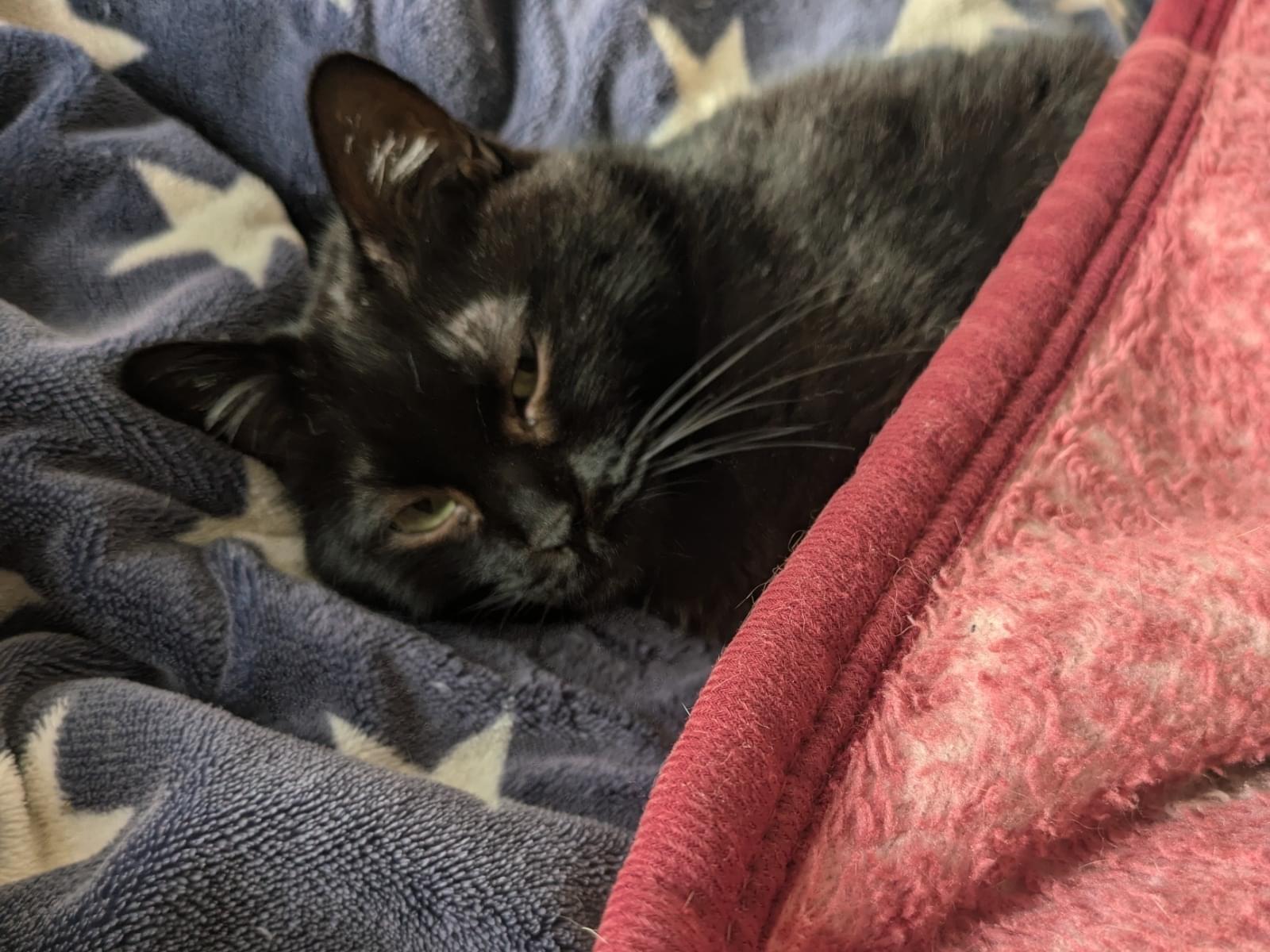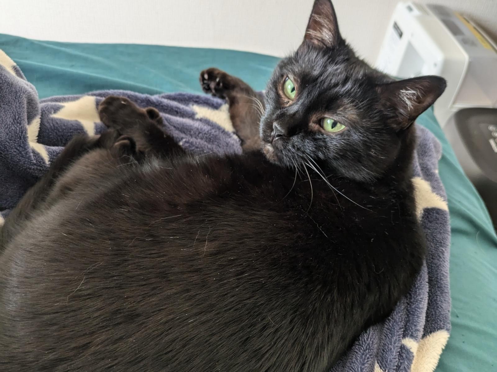 黒猫ですが、胸とお腹に白いポイントがあります。